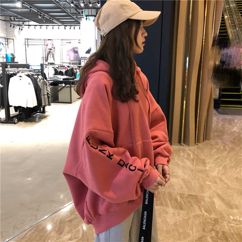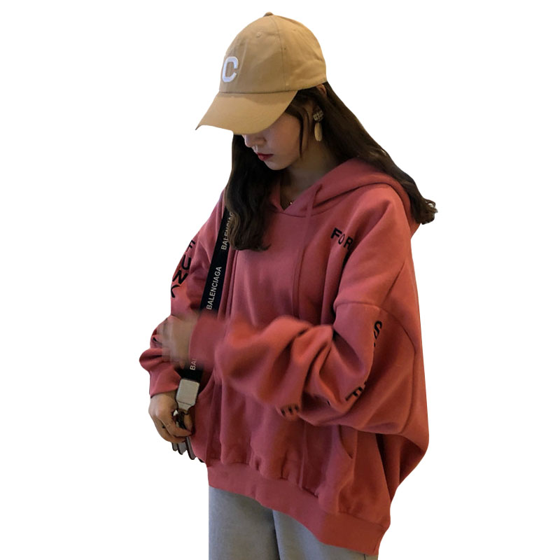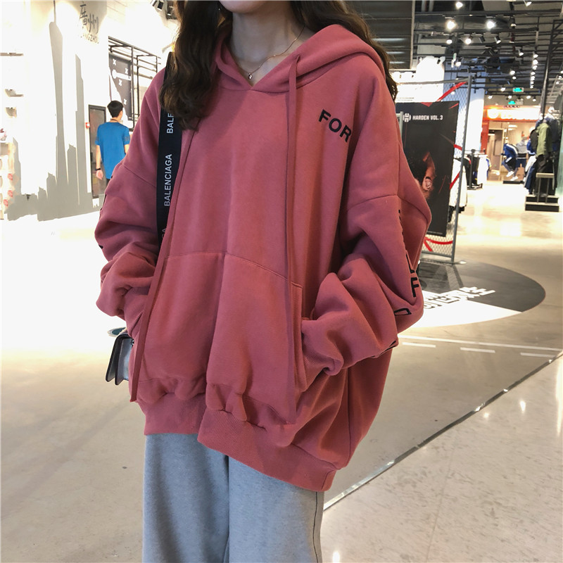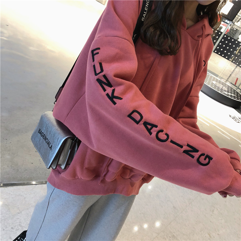 / 2018新款秋冬韓版中長款刺繡字母寬松連帽加絨加厚超火衛衣外套女