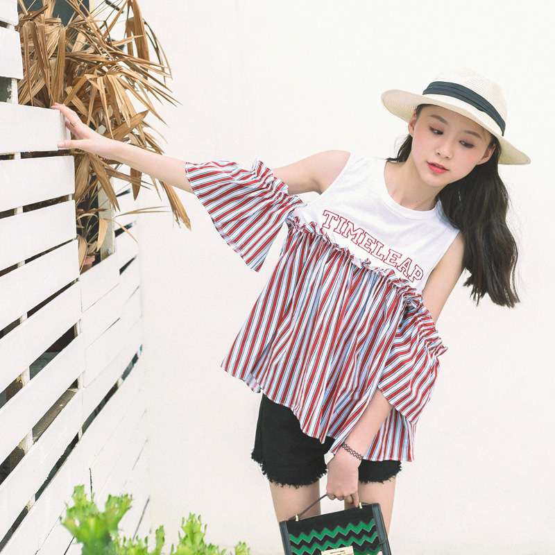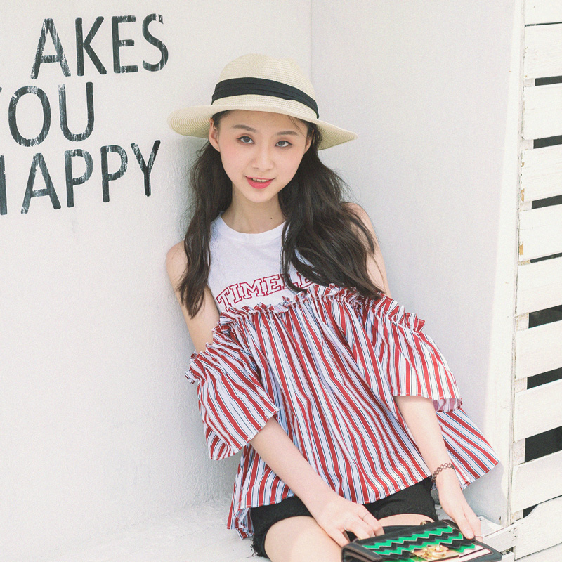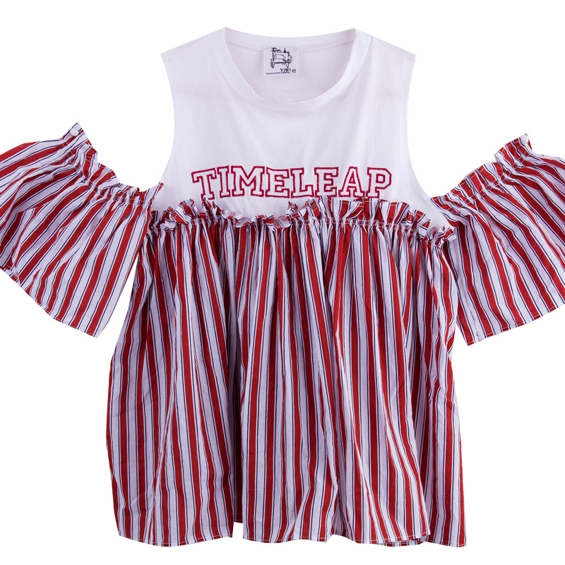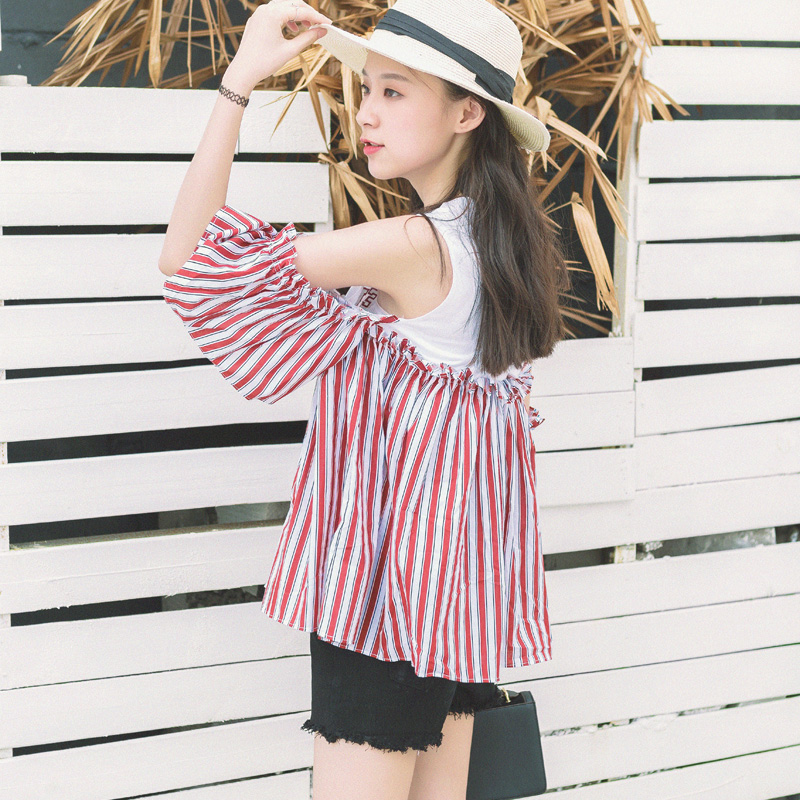 / 夏裝新款韓版女裝露肩短袖t恤條紋拼接假兩件寬松體恤上衣潮