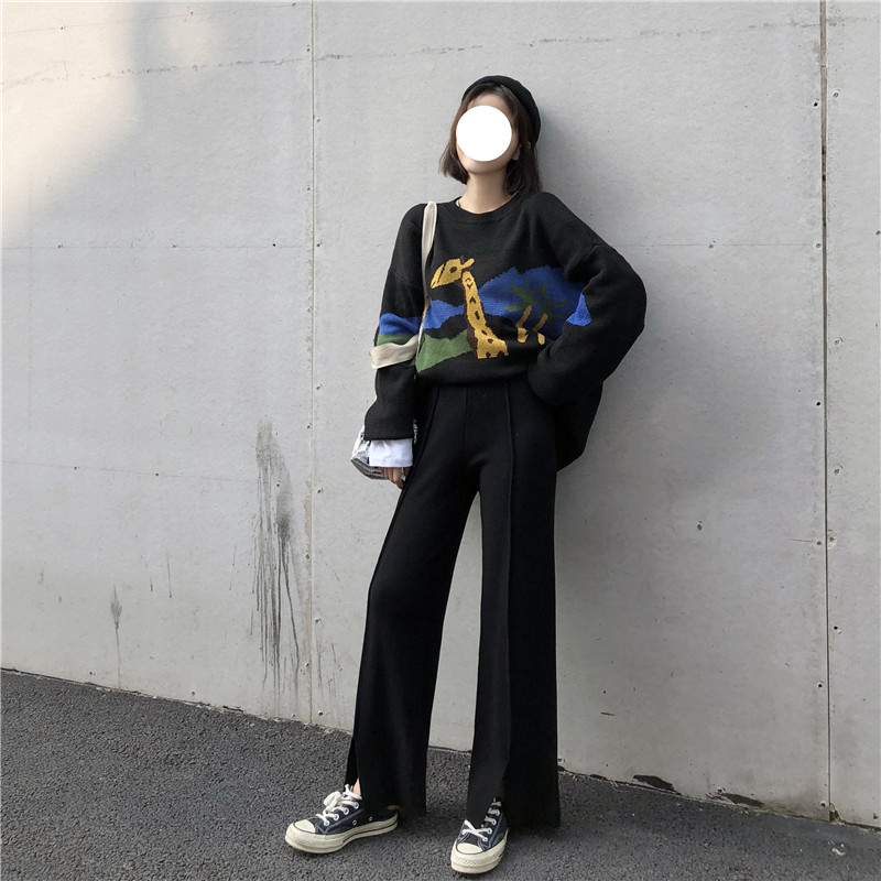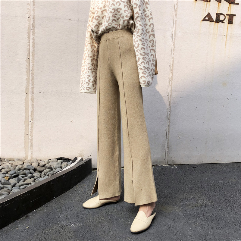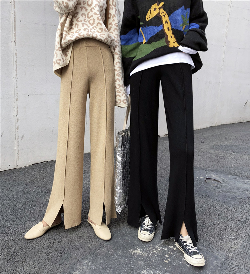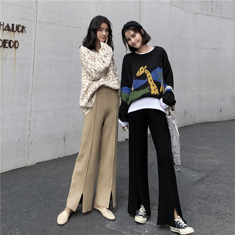 2018秋季韓版時尚開叉針織闊腿褲寬松顯瘦休閑保暖長褲女閨蜜裝潮