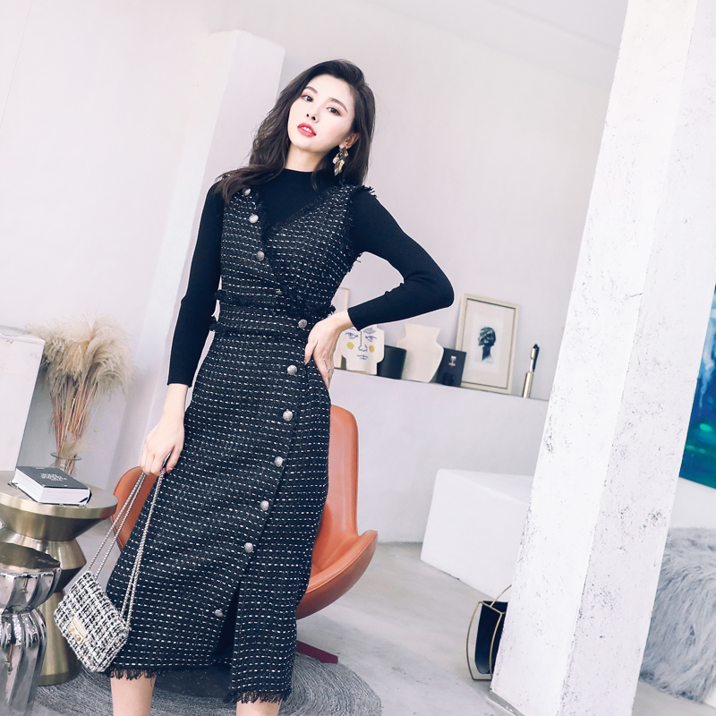 / 網紅時尚毛呢背帶連衣裙秋冬裝女2018新款氣質毛衣裙子兩件套裝
