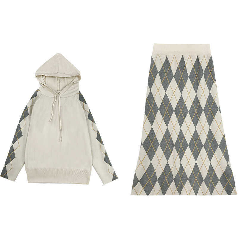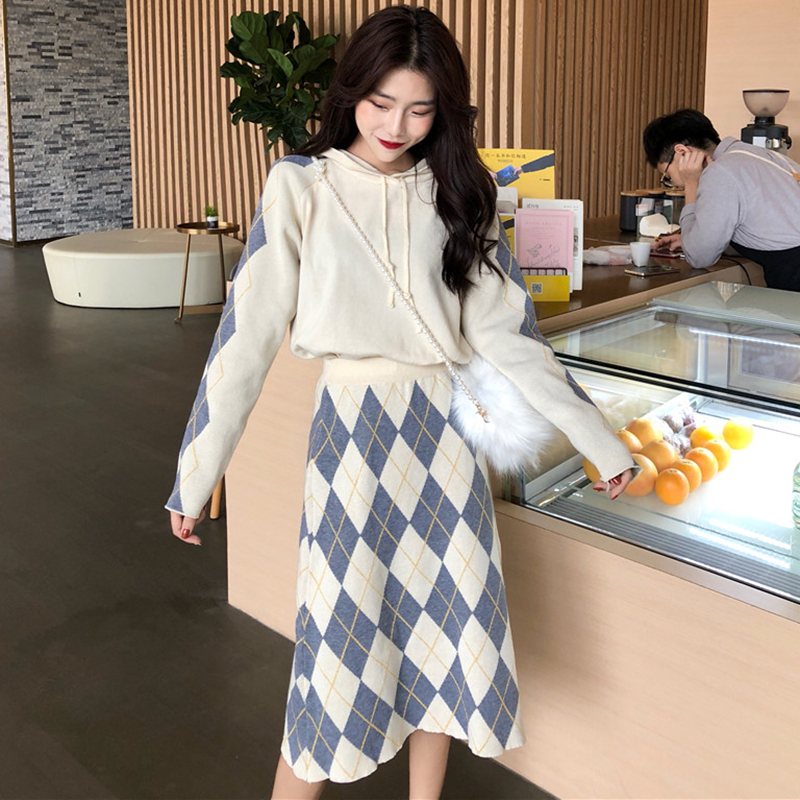 / 網紅洋氣套裝冬裝女新款慵懶套頭毛衣連帽外套復古格子針織半身裙
