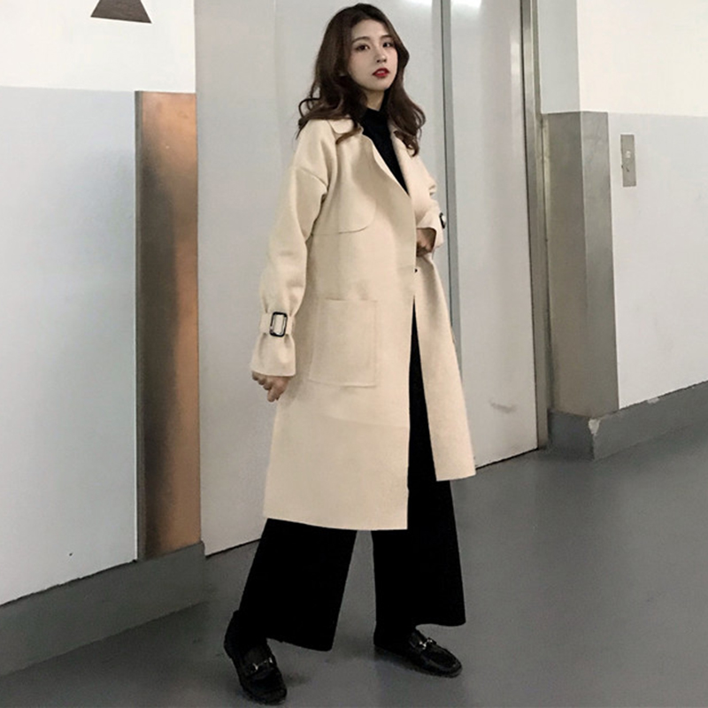 2018流行毛呢外套女秋冬裝新款赫本大衣寬松過膝開衫純色休閑上衣