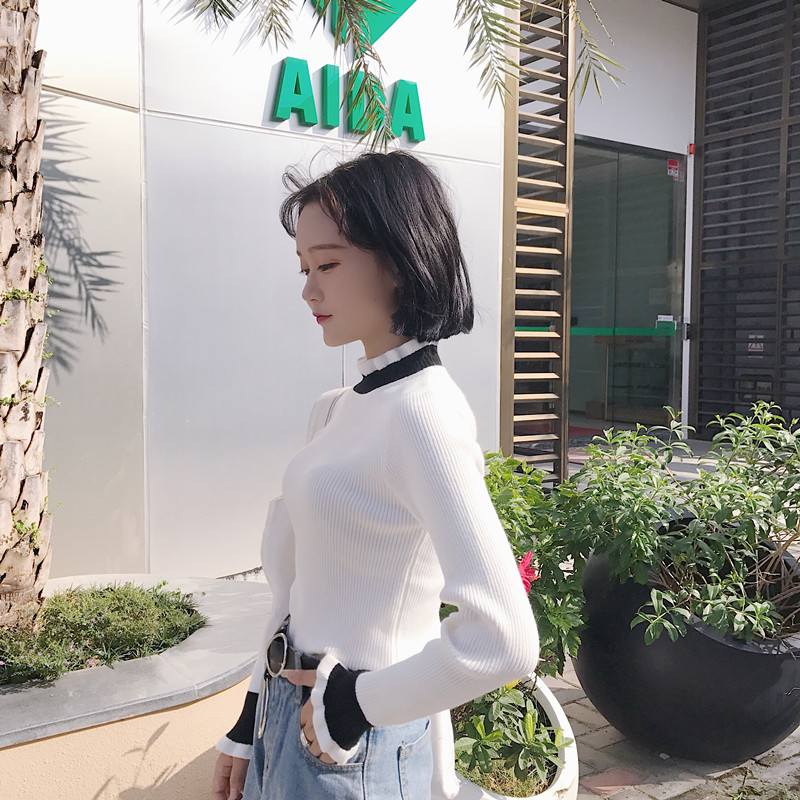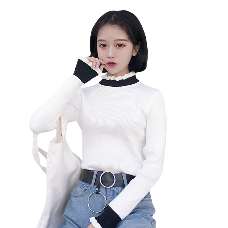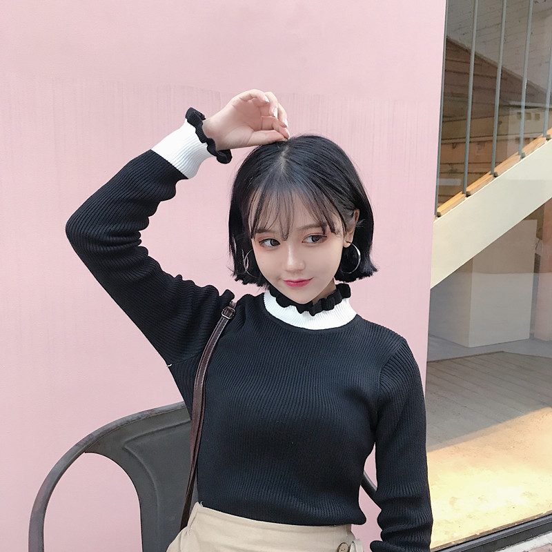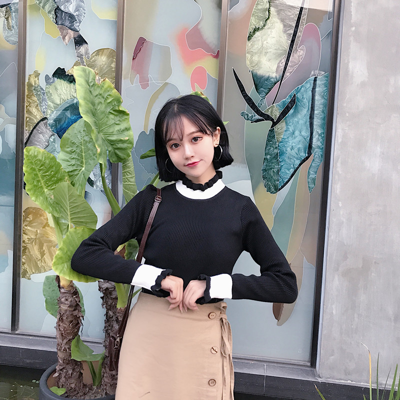 / 秋冬女裝韓版百搭彈力修身顯瘦撞色木耳長袖針織衫打底衫毛衣上衣