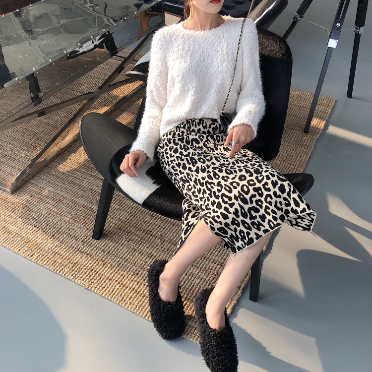 / 新款純色顯瘦上衣毛絨絨寬松毛衣女針織衫豹紋包臂半身裙時尚套裝