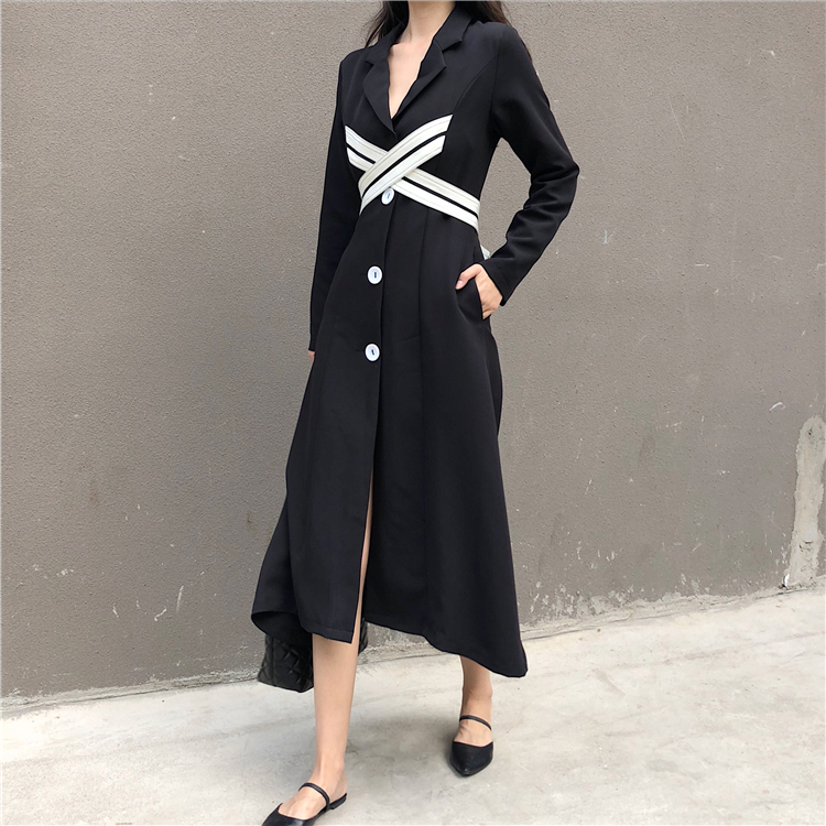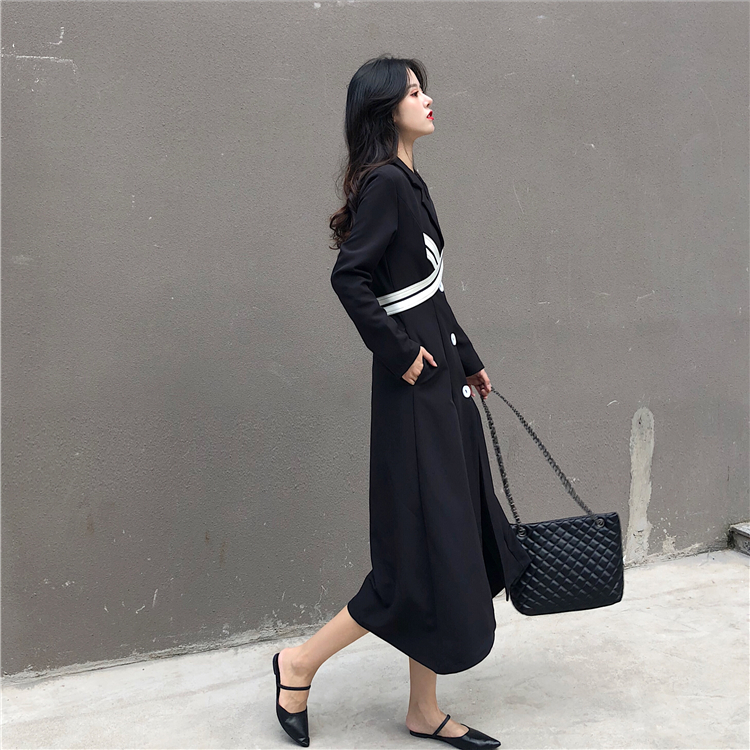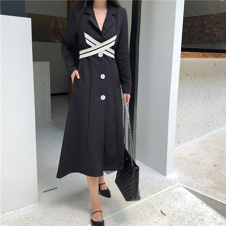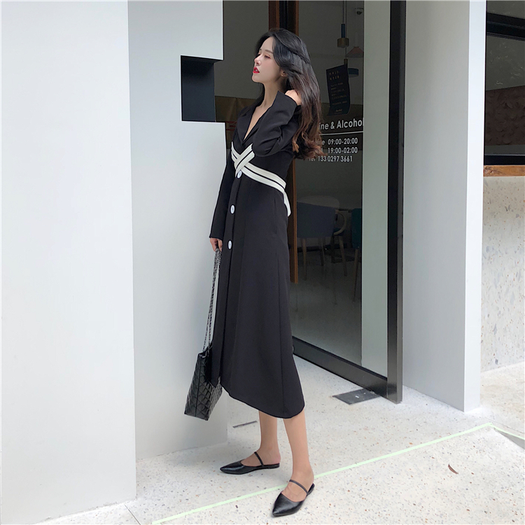 新款韓版百搭秋冬顯瘦chic風長袖連衣裙氣質收腰修身中長款裙子女