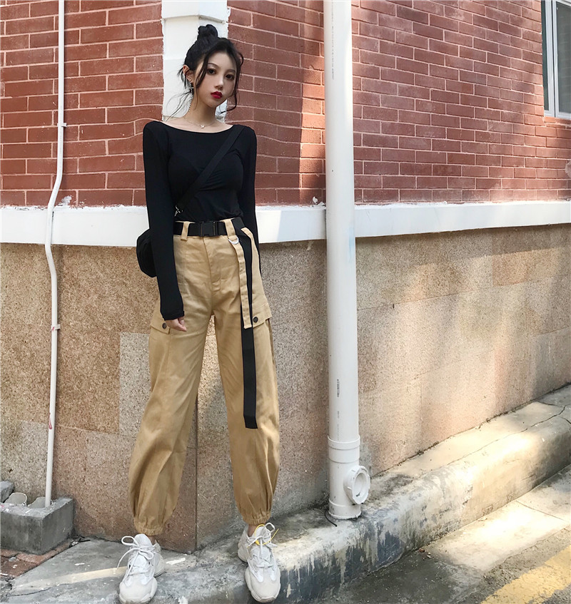 / 港味chic新款韓版時尚套裝長袖修身打底T恤高腰工裝長褲女配腰帶