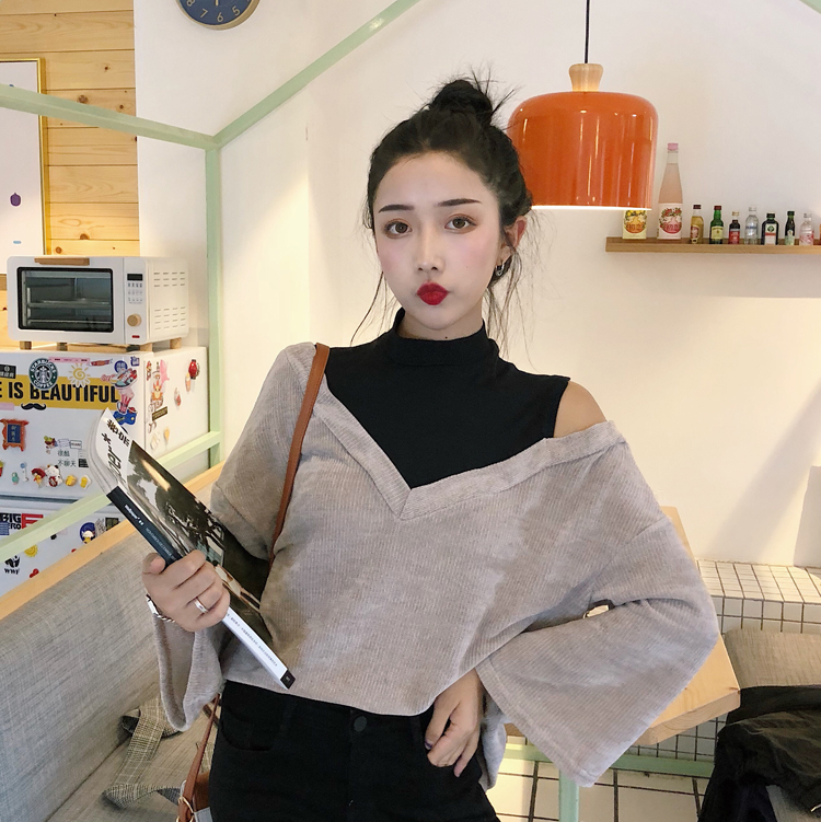 2018新款復古韓風小高領假兩件氣質百搭T恤拼色時尚寬松顯瘦上衣