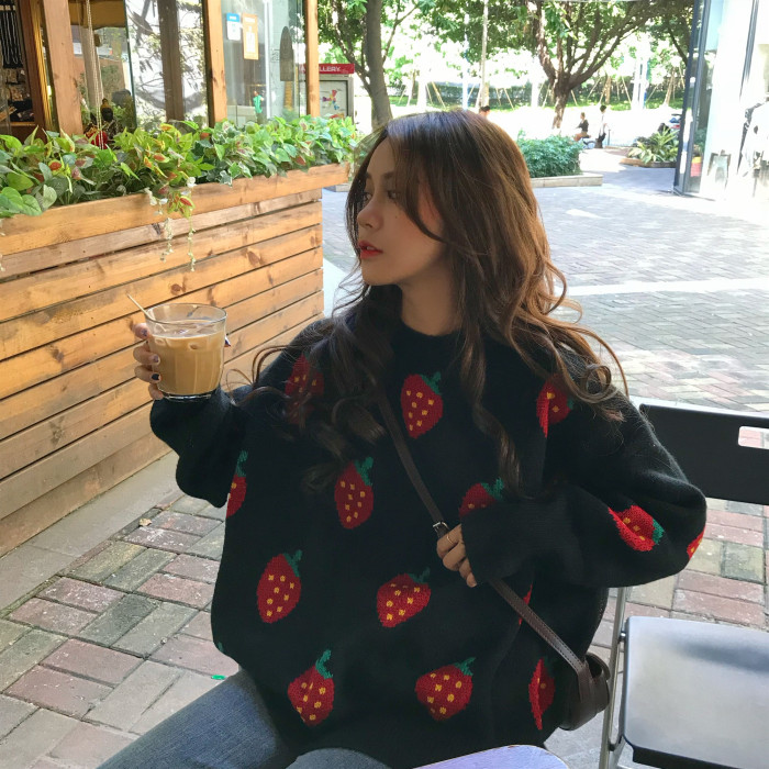 / 草莓提花寬松圓領加厚保暖慵懶風套頭毛衣女2018新款秋冬長袖上衣
