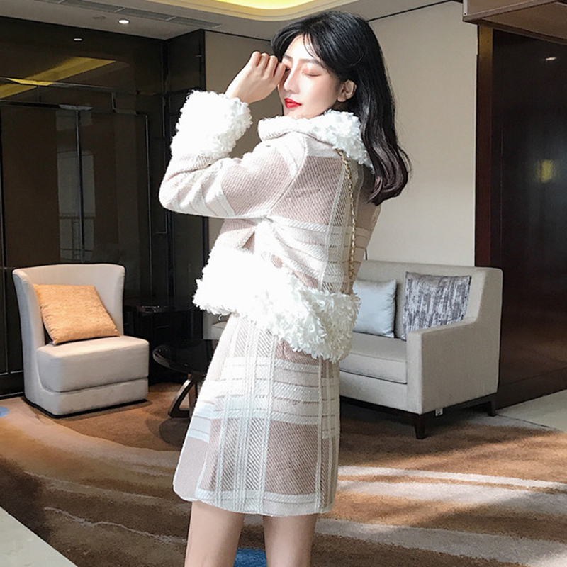 赫本風套裝女秋冬新款打底衫羊羔毛拼接格紋呢子短外套毛呢半身裙