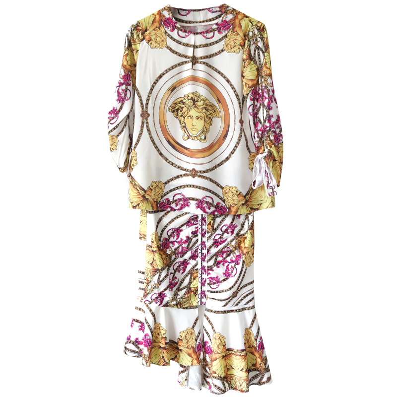 / 歐洲站名媛套裝夏季2018新款印花蝴蝶結上衣開叉半裙時尚兩件套潮