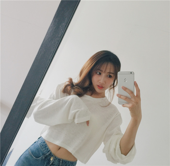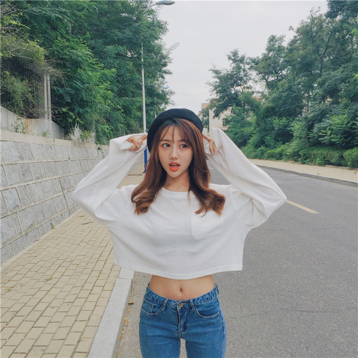 / 春夏新款女裝韓版純色百搭寬松漏肚臍長袖上衣顯瘦短款白色t恤女