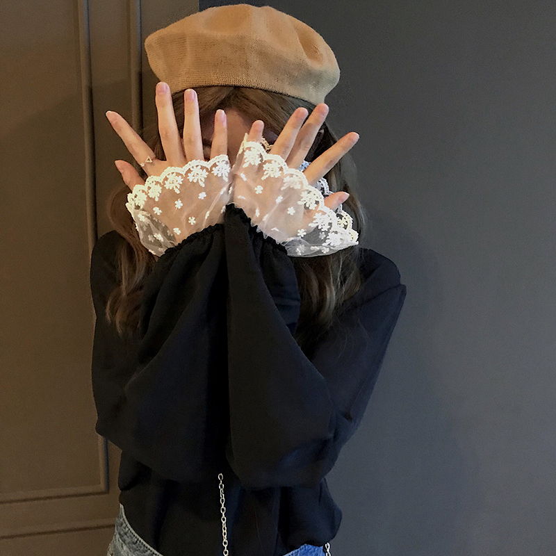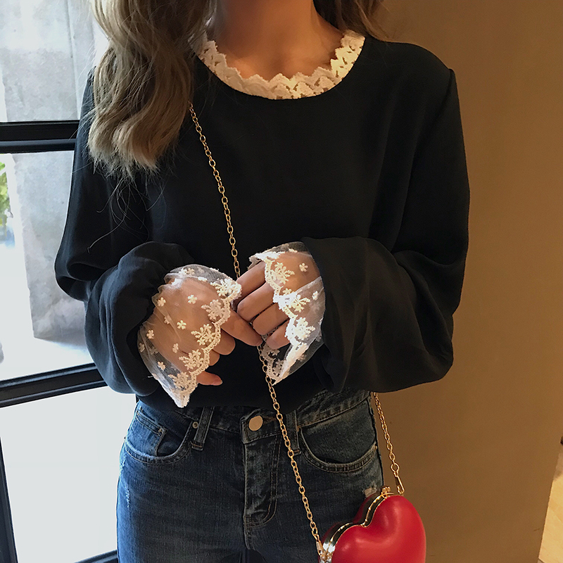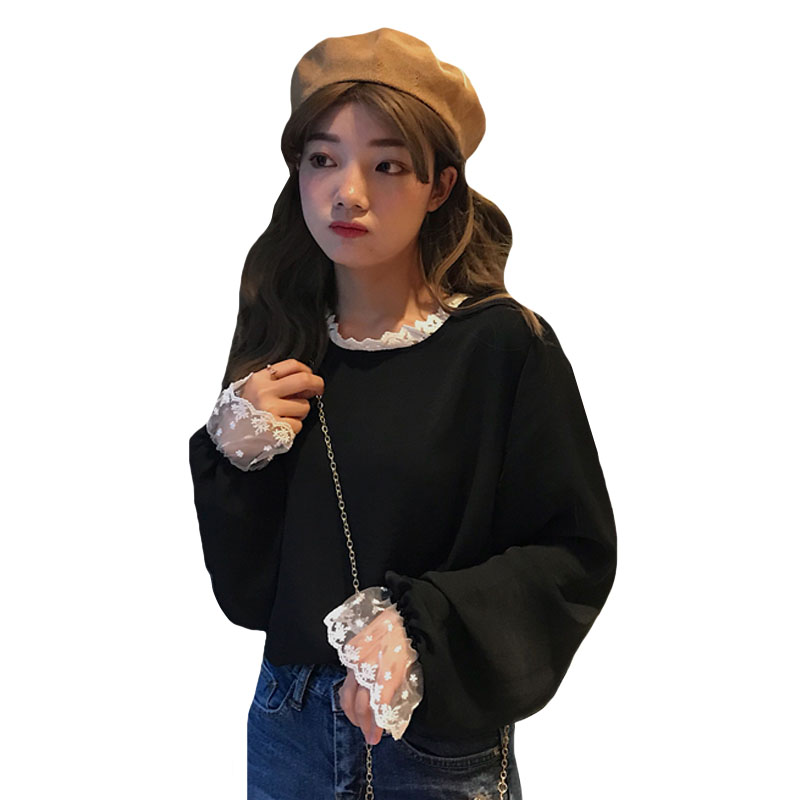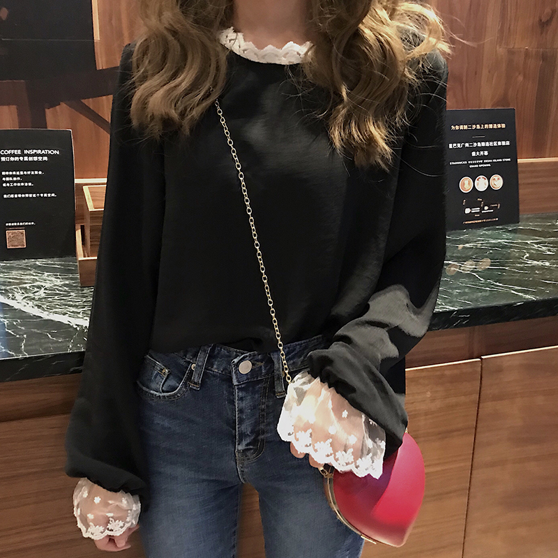 / 秋季女裝2018新款韓版chic寬松圓領拼接蕾絲邊長袖雪紡衫襯衫上衣