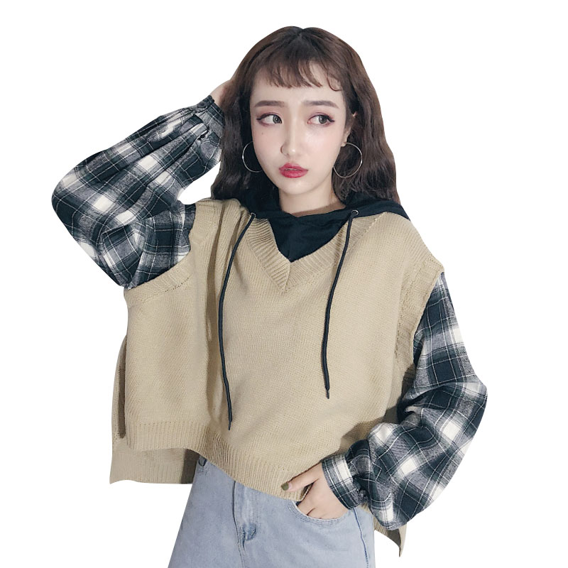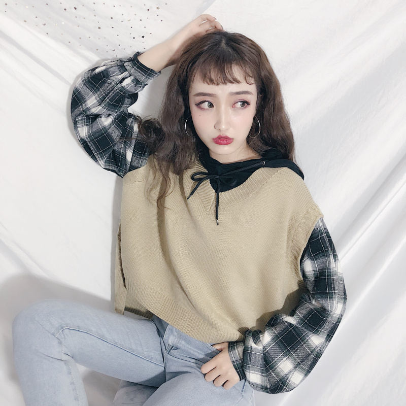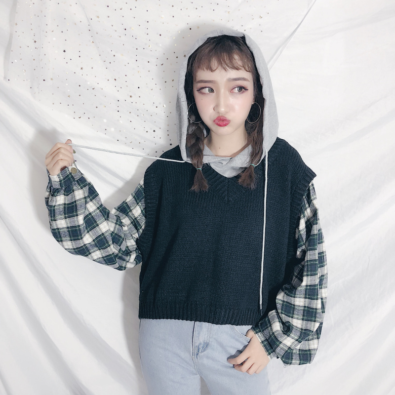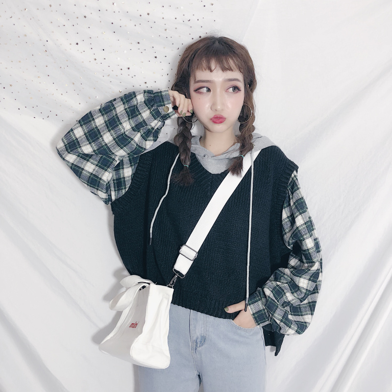 2018新款秋季韓版BF風寬松連帽假兩件拼接長袖套頭衛衣上衣外套女