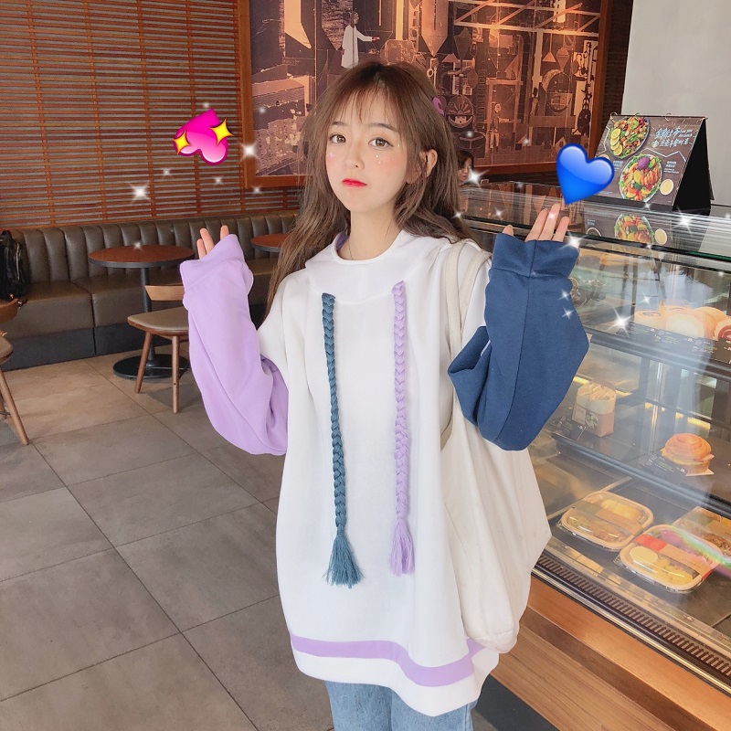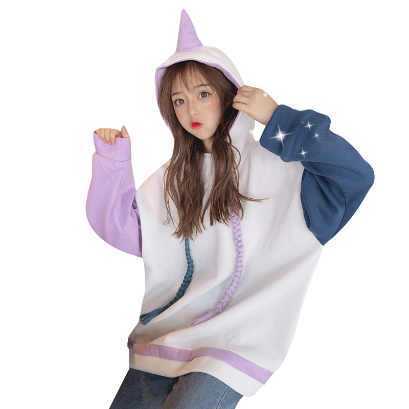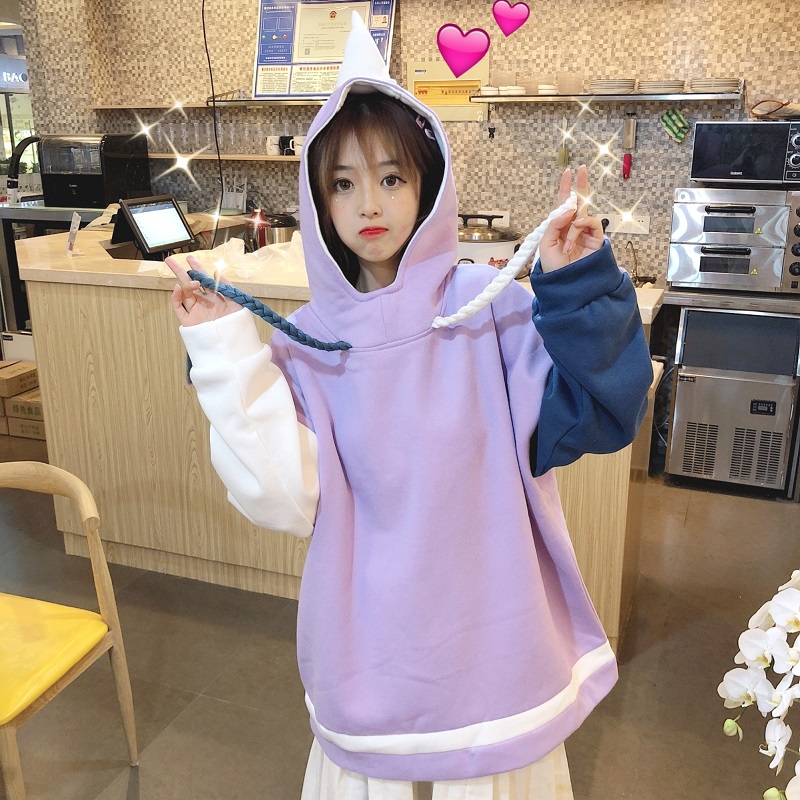 2018新款秋冬女裝韓版寬松學院風撞色獨角獸連帽套頭衛衣上衣外套