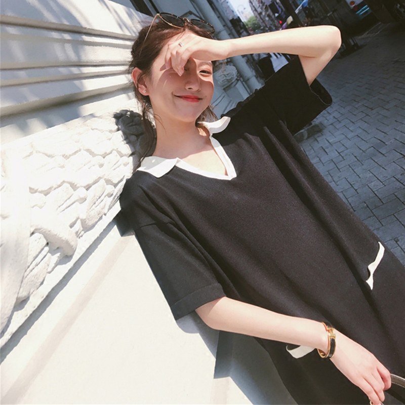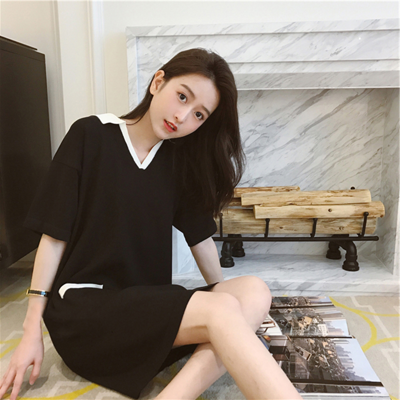 2018夏裝新款冷淡風連衣裙女純色V領chic小黑色裙寬松顯瘦潮學生