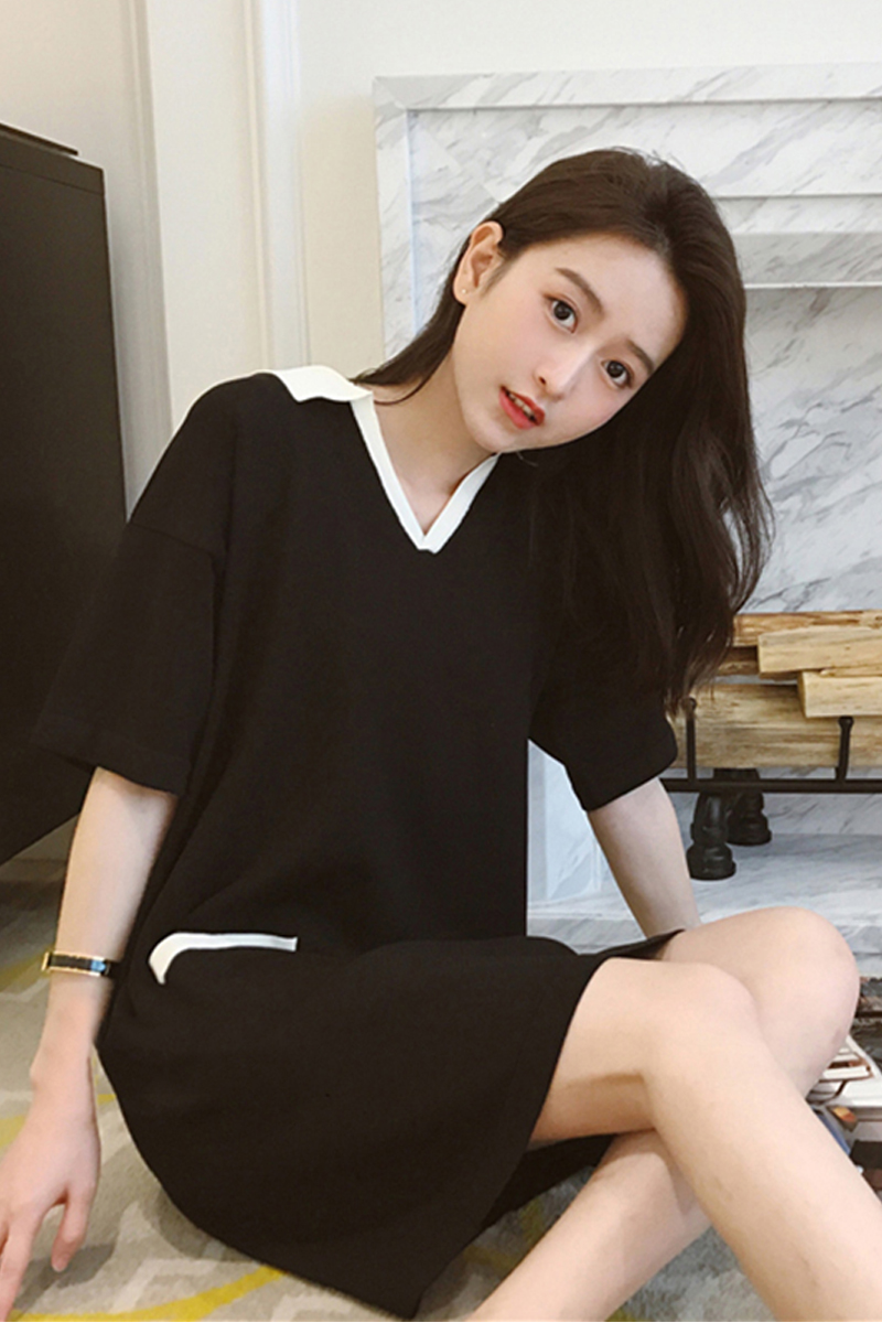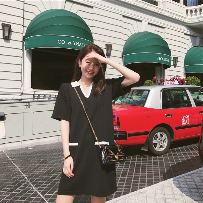 / 2018夏裝新款冷淡風連衣裙女純色V領chic小黑色裙寬松顯瘦潮學生