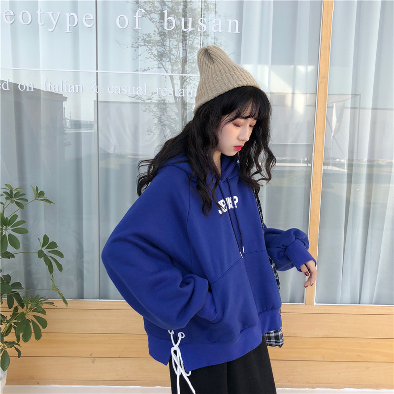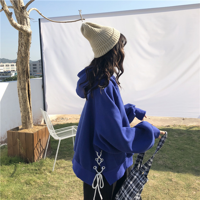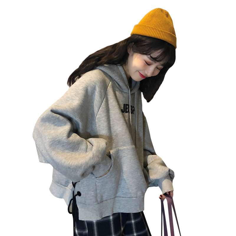 2018新款秋冬女裝韓版寬松加絨加厚字母綁帶連帽套頭衛衣上衣外套