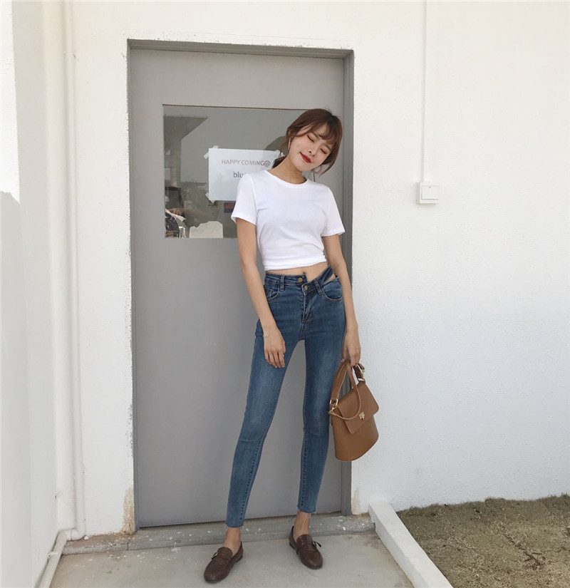/ 秋季新款復古韓國不規則高腰顯瘦百搭小腳褲水洗做舊九分牛仔褲潮