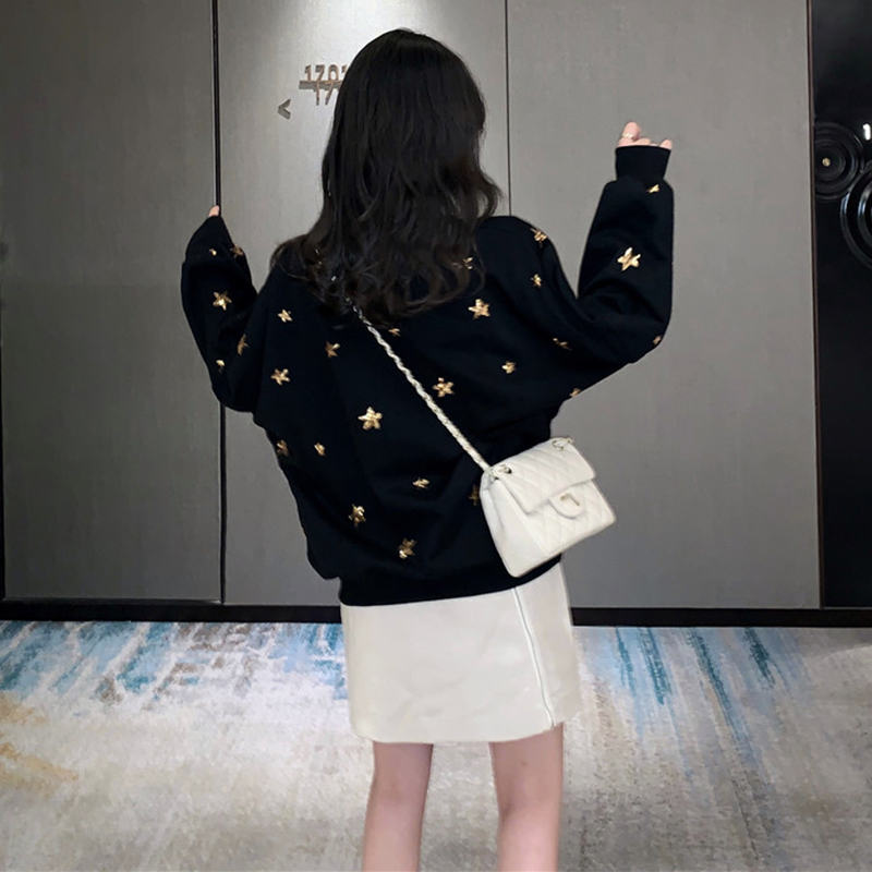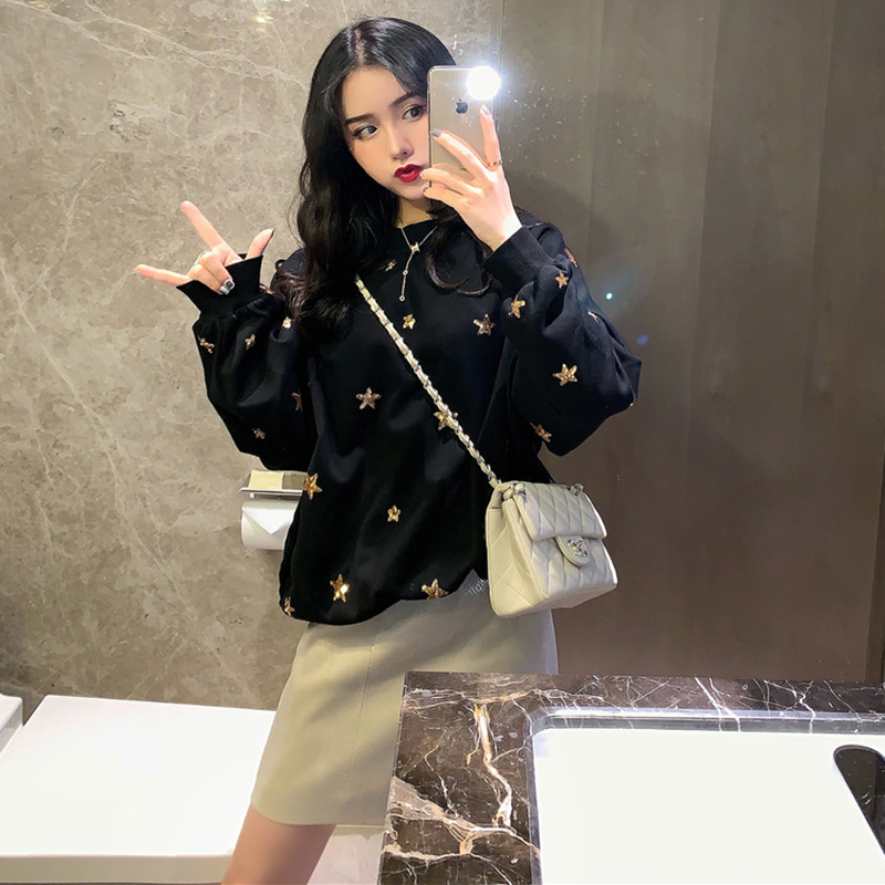 / 時尚套裝秋冬女2018新款寬松星星刺繡衛衣氣質高腰顯瘦A字皮短裙