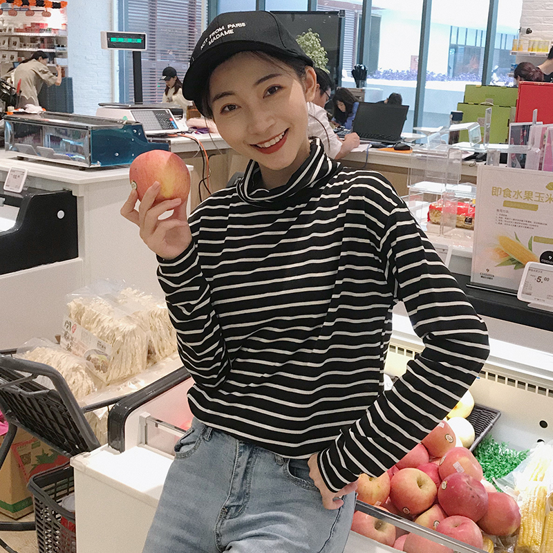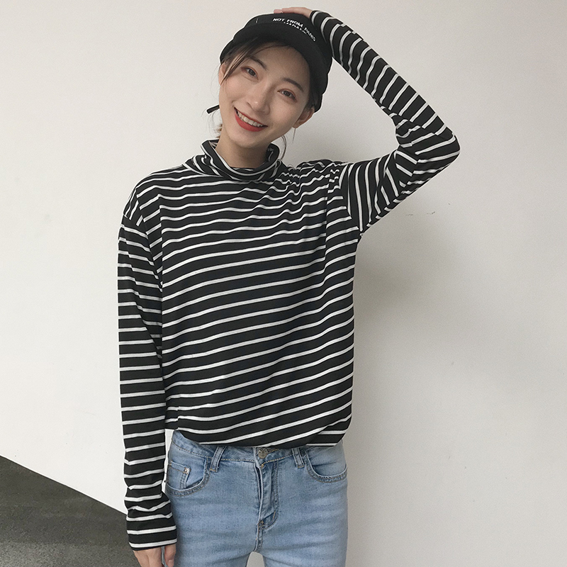 時尚條紋高領打底衫女秋冬裝新款彈力長袖上衣學院風外穿套頭T恤