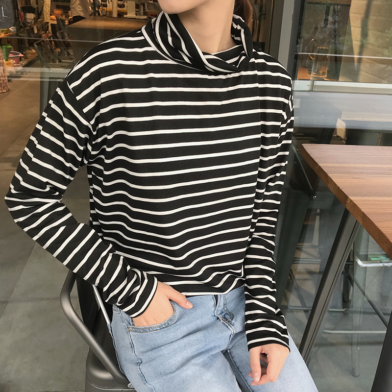 / 時尚條紋高領打底衫女秋冬裝新款彈力長袖上衣學院風外穿套頭T恤