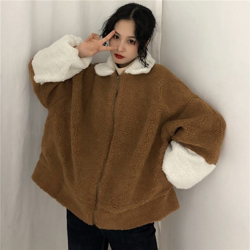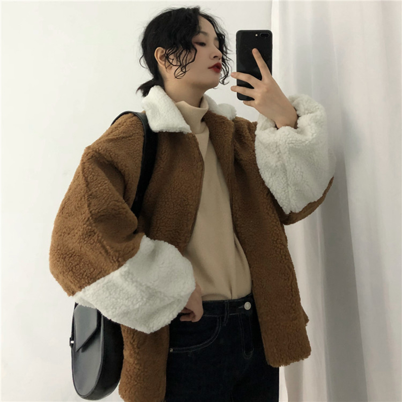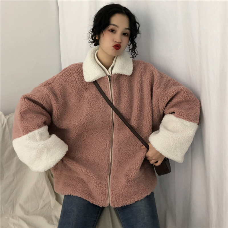 / 時尚拼色羊羔毛外套秋冬女裝2018新款港風保暖開衫寬松長袖上衣潮