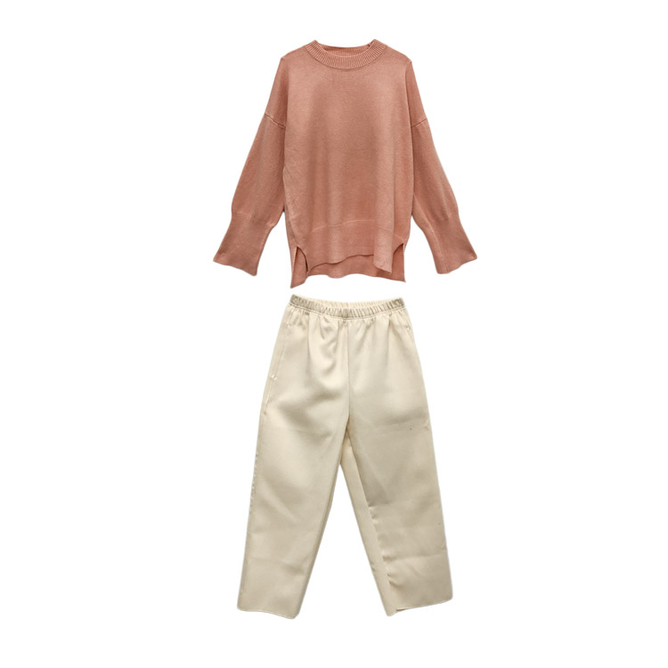 女神套裝秋兩件套純色打底薄款粉色針織上衣+高腰墜感休閑闊腿褲