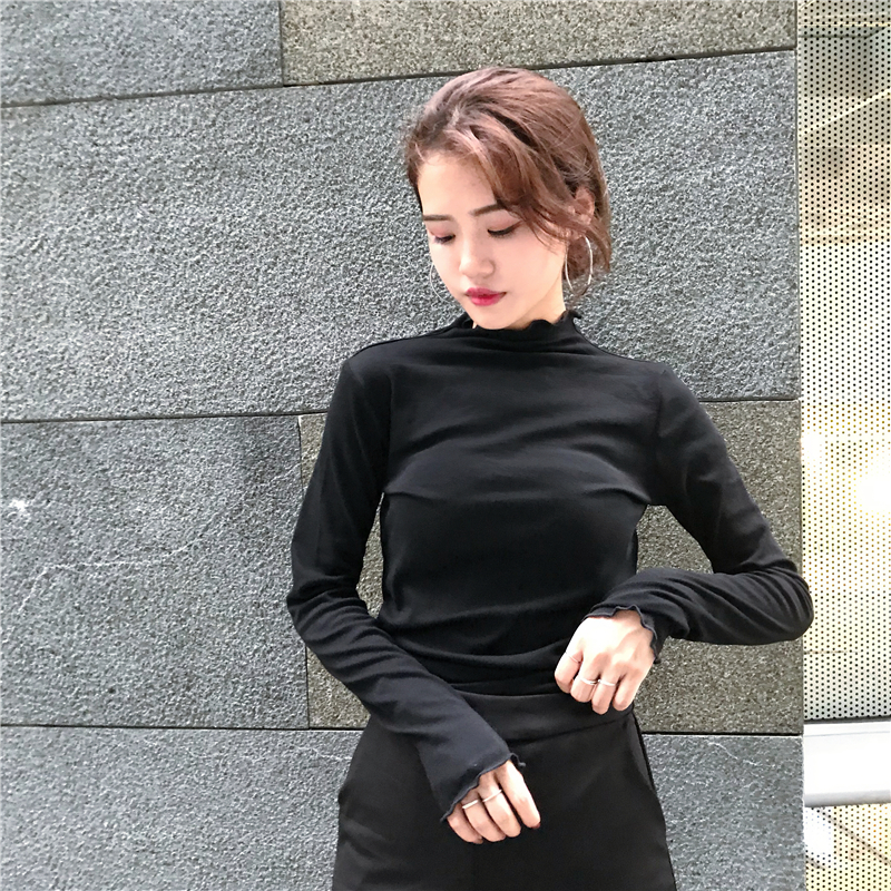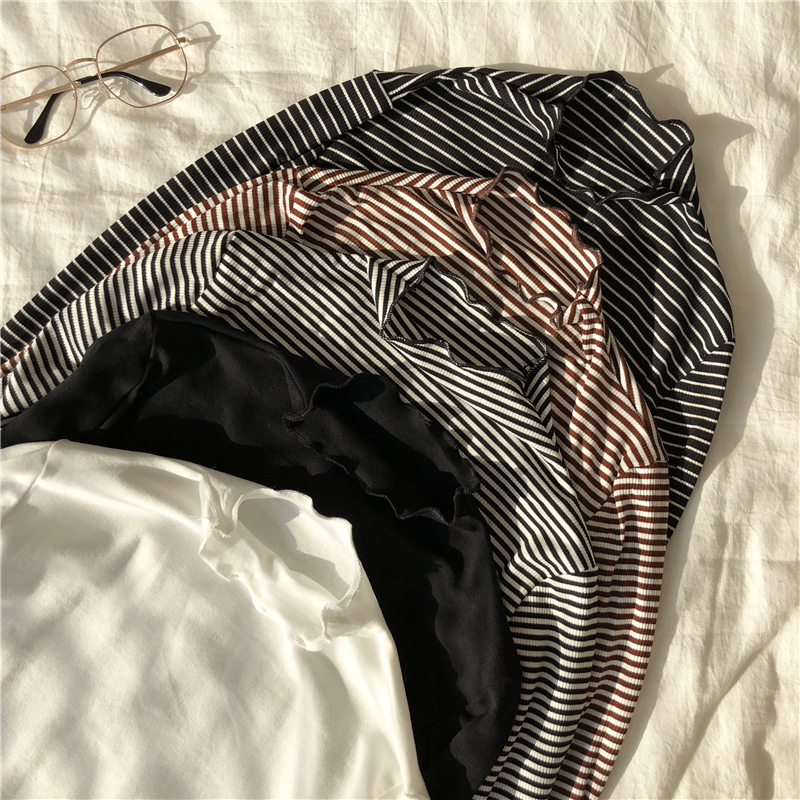 / 秋裝女裝韓版撞色條紋修身顯瘦波紋半高領長袖打底衫T恤上衣學生
