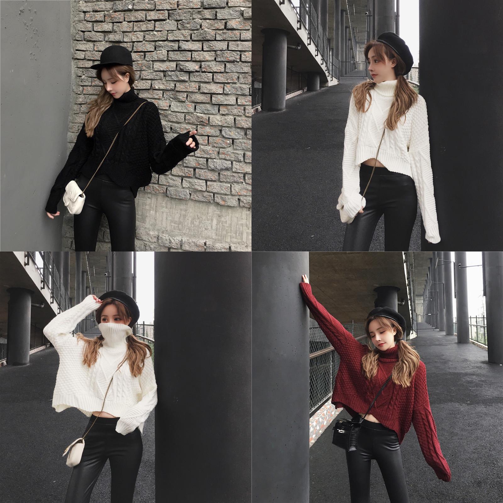/ 復古女神套裝秋冬高領麻花毛衣+高腰加絨外穿打底皮褲長褲兩件套