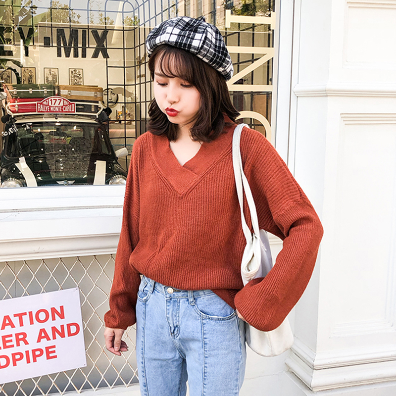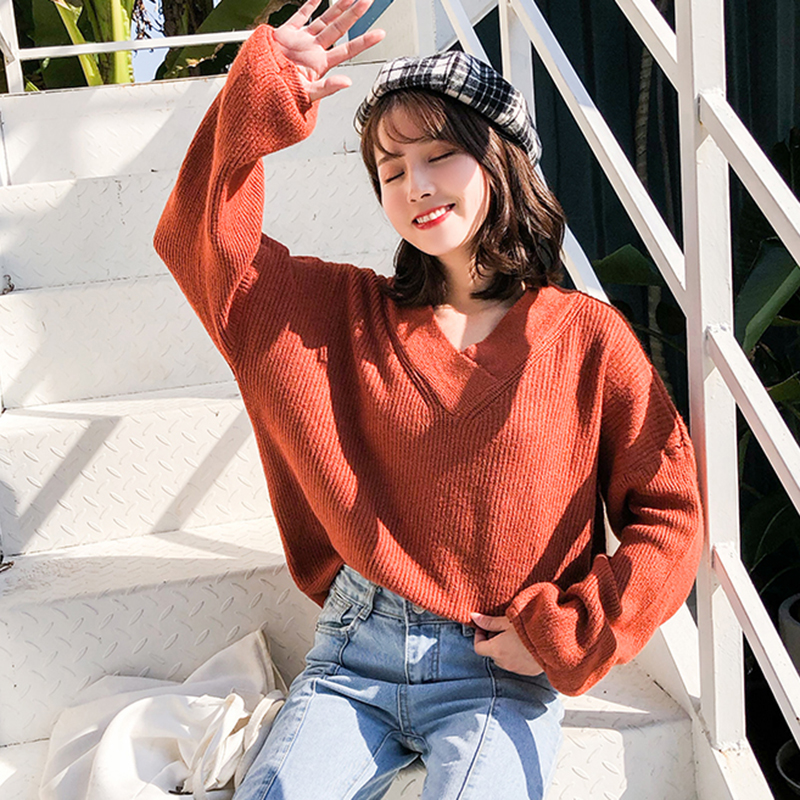 慵懶休閑純色毛衣秋裝女2018新款甜美學生長袖V領上衣簡約針織衫