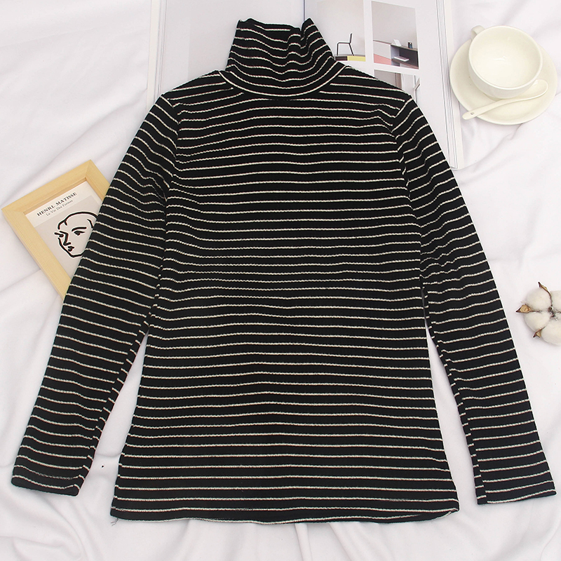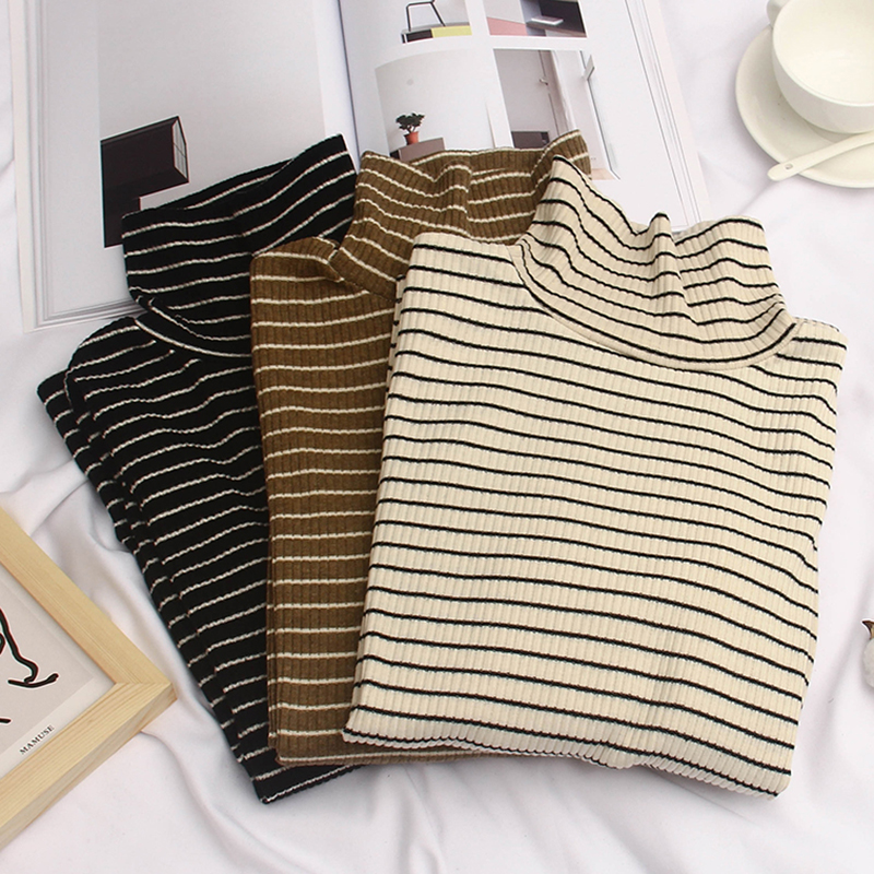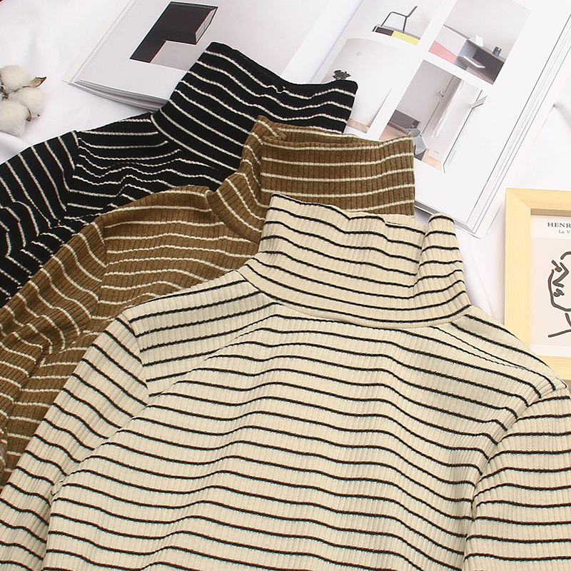 / 高領修身顯瘦打底衫女秋冬裝新款學院風條紋長袖上衣外穿套頭T恤