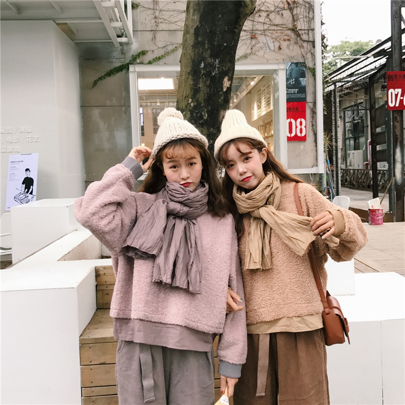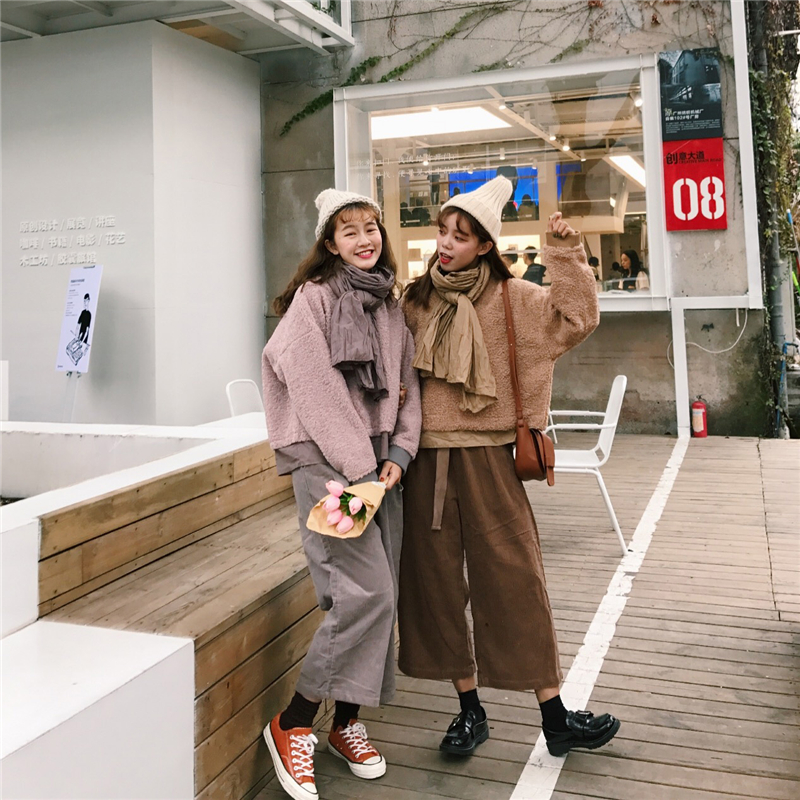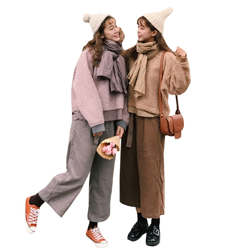 / 韓版時尚休閑套裝秋冬女裝仿羊羔毛衛衣外套+燈芯絨闊腿褲兩件套