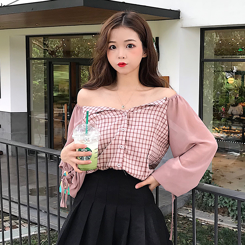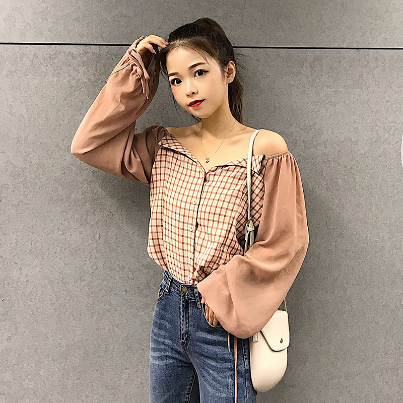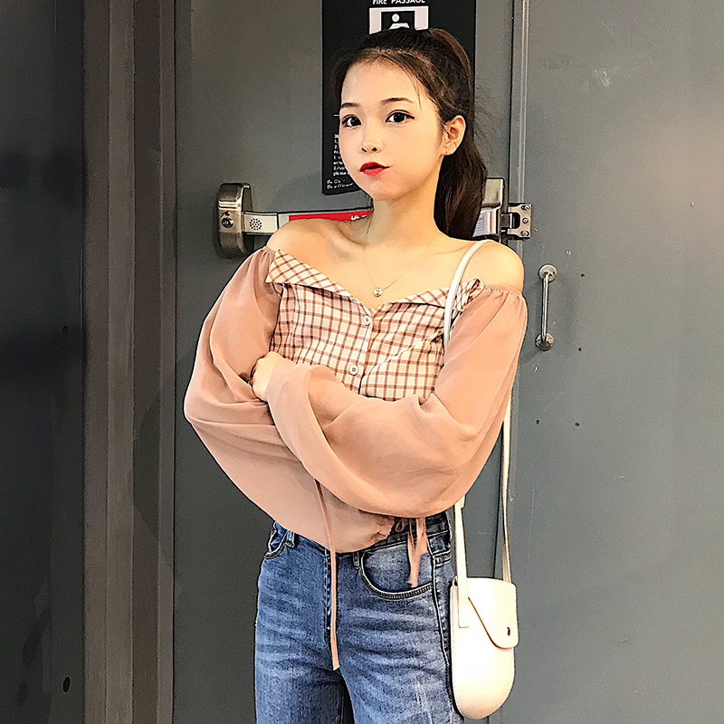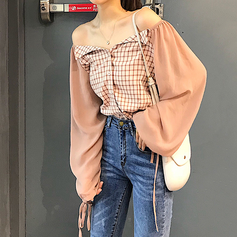 / 格子拼接雪紡襯衫女秋裝新款系帶寬松燈籠長袖襯衣氣質露肩短上衣