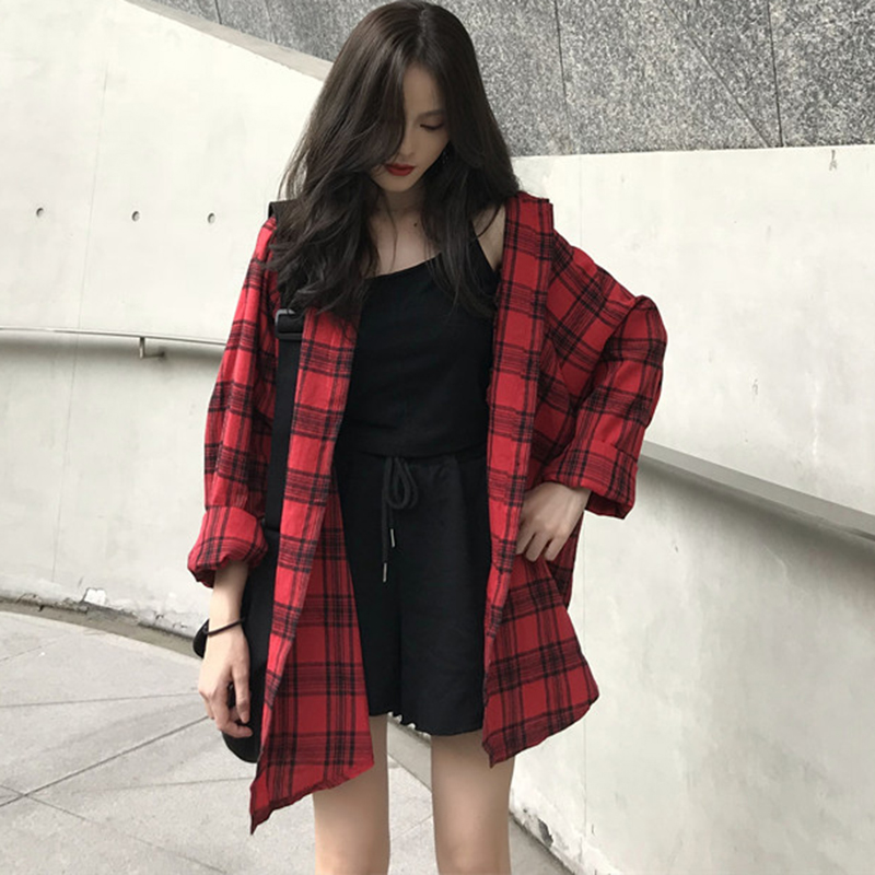 / 襯衣女夏季新款韓版女裝中長款寬松格子襯衫休閑百搭長袖防曬開衫