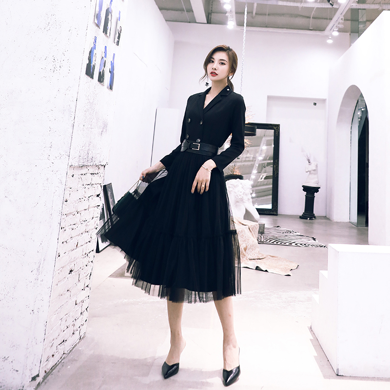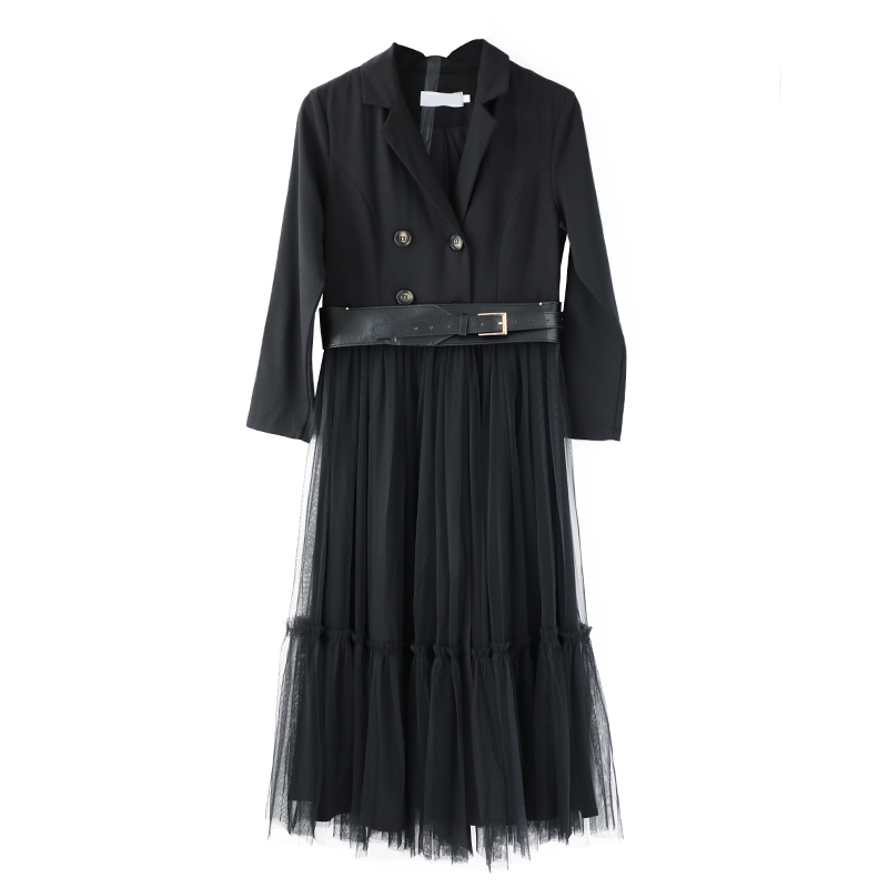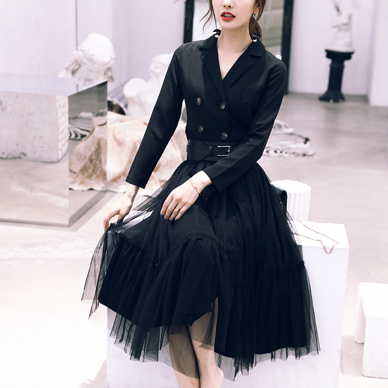 / 中長款V領連衣裙2018秋裝女新款韓版系帶排扣風衣網紗半身裙套裝