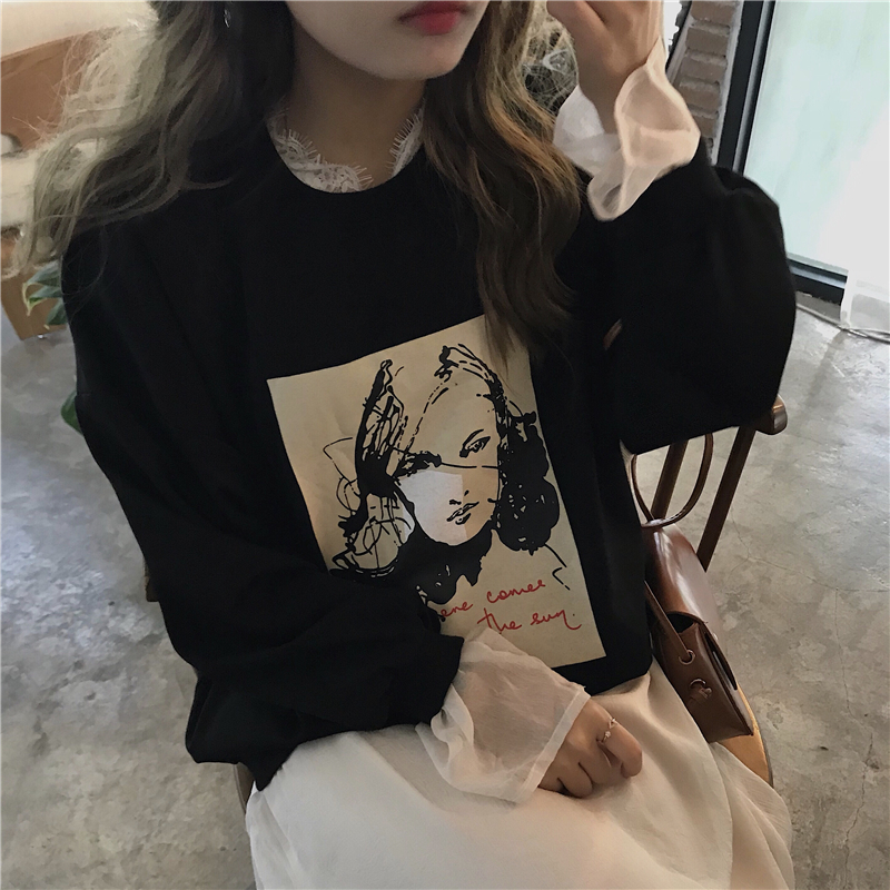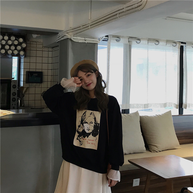 時尚百搭人頭印花長袖圓領衛衣2018新款女長袖韓版寬松顯瘦上衣潮
