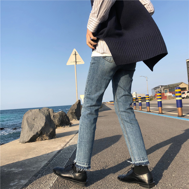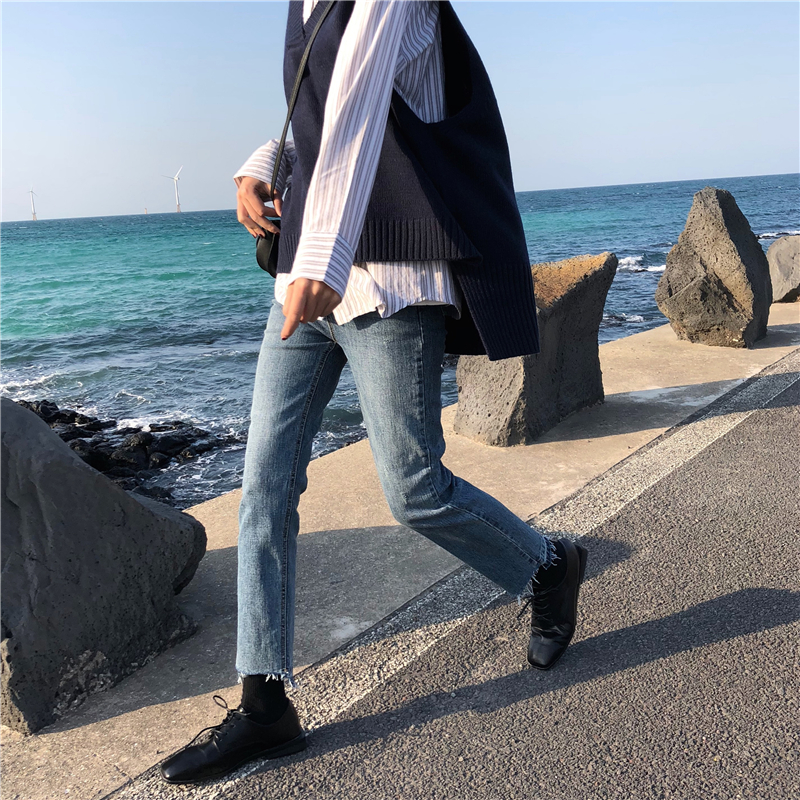 可可里小姐~褲腳撞色不規則百搭直筒牛仔褲女