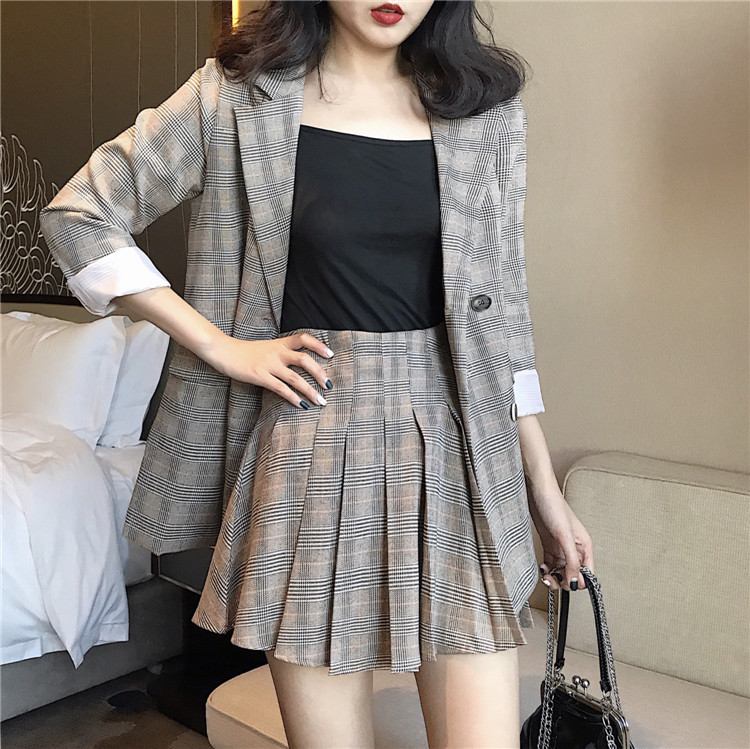 2018秋冬新款時尚套裝西裝格子外套高腰百褶裙九分褲西裝三件套女