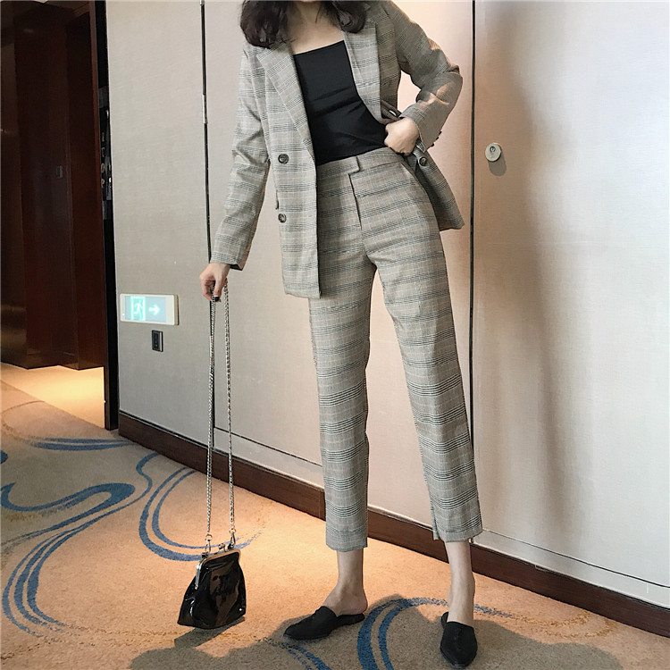 / 2018秋冬新款時尚套裝西裝格子外套高腰百褶裙九分褲西裝三件套女