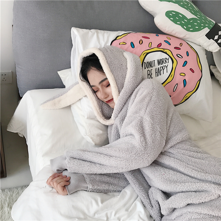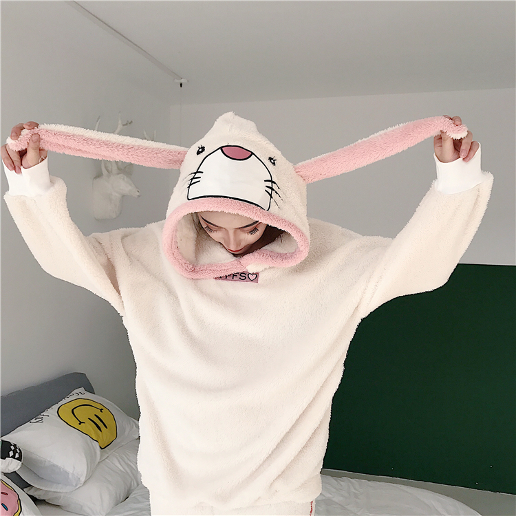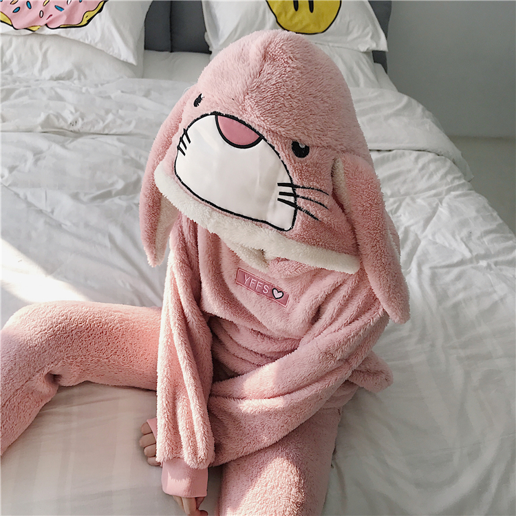 / 加絨加厚舒適珊瑚絨兔子耳朵睡衣新款可愛卡通連帽情侶家居服套裝