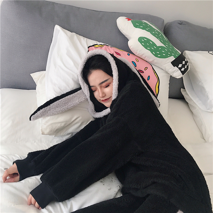 加絨加厚舒適珊瑚絨兔子耳朵睡衣新款可愛卡通連帽情侶家居服套裝