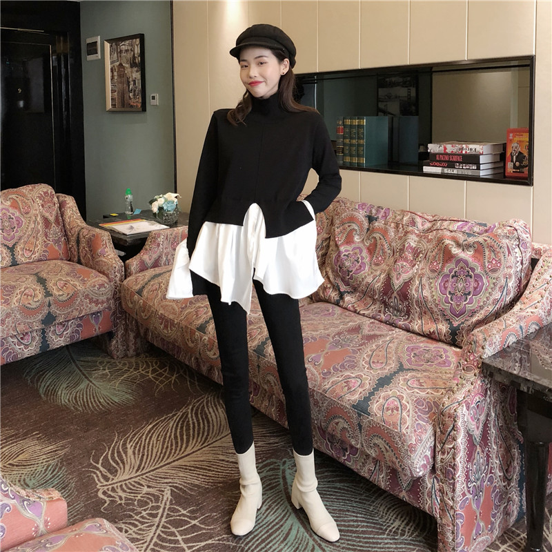 / 韓版毛衣女2018新款假兩件拼色半高領不規則喇叭袖襯衫針織衫上衣