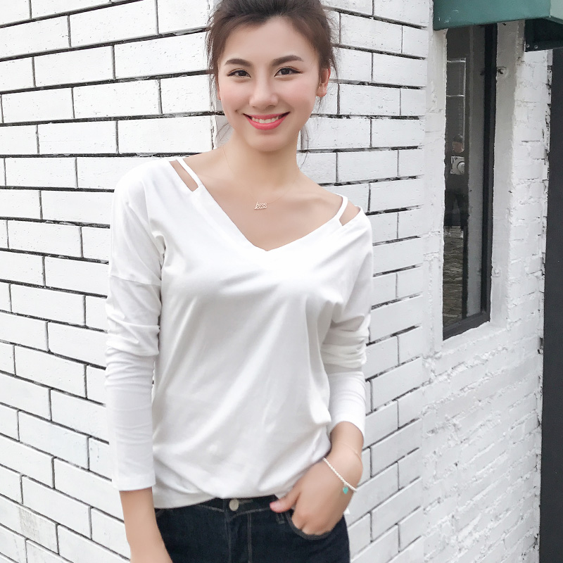 / 春裝新款寬松大碼顯瘦長袖T恤女打底衫純色純棉上衣體恤衫