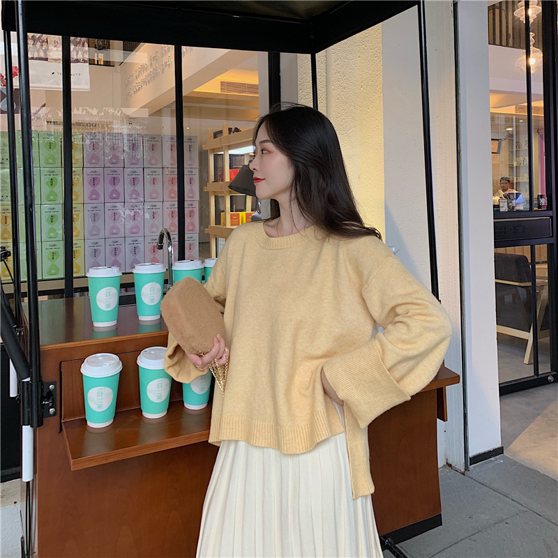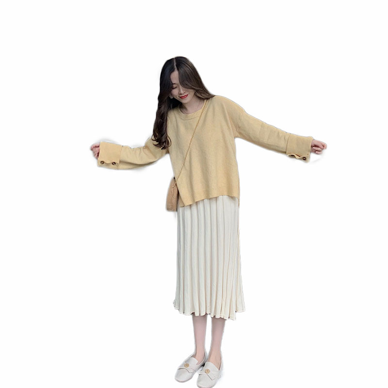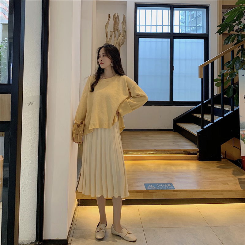 / 慵懶風寬松毛衣女套頭長袖針織衫上衣+中長款高腰百褶半身裙套裝