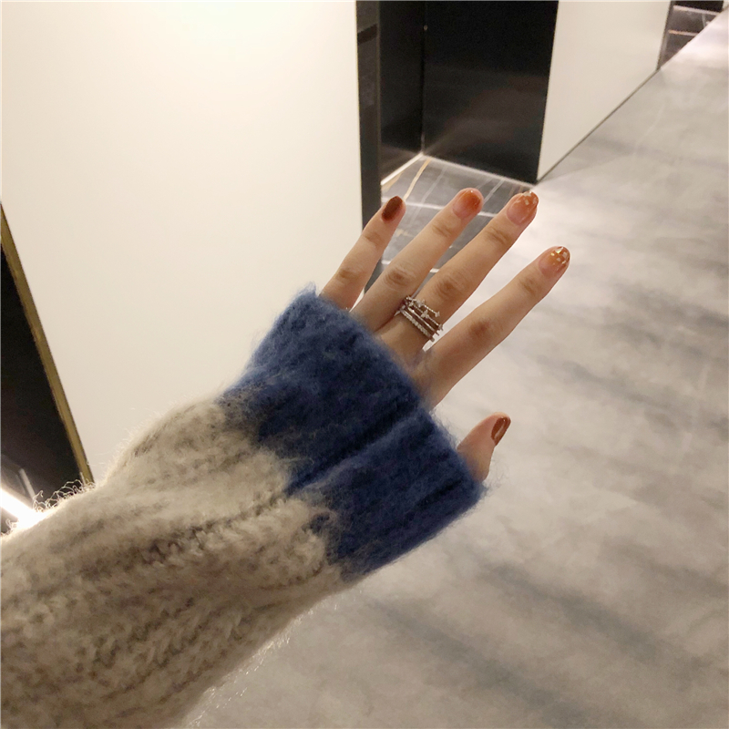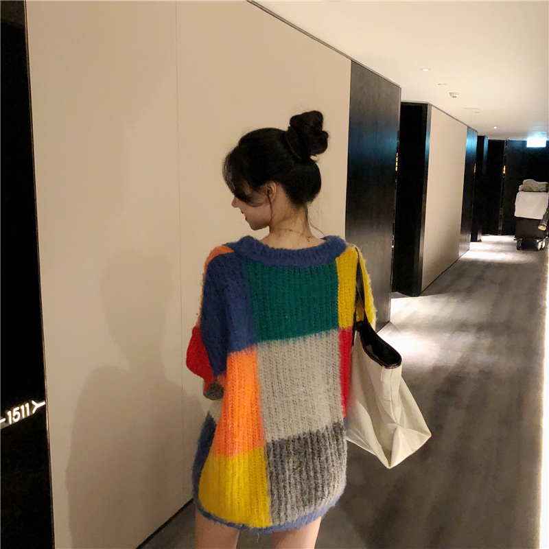 chic慵懶風毛衣女套頭寬松加厚秋季拼接格子甜美小清新學生針織衫