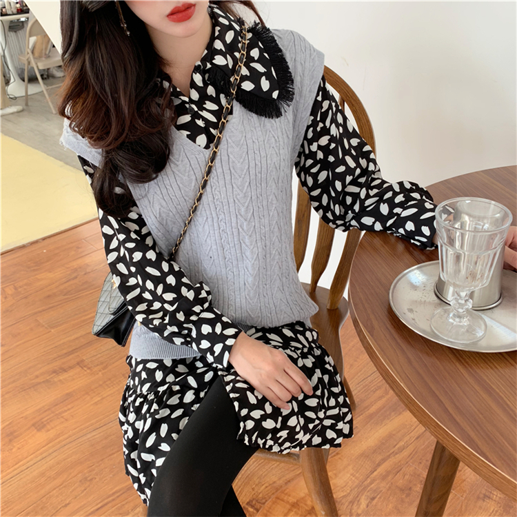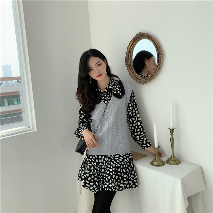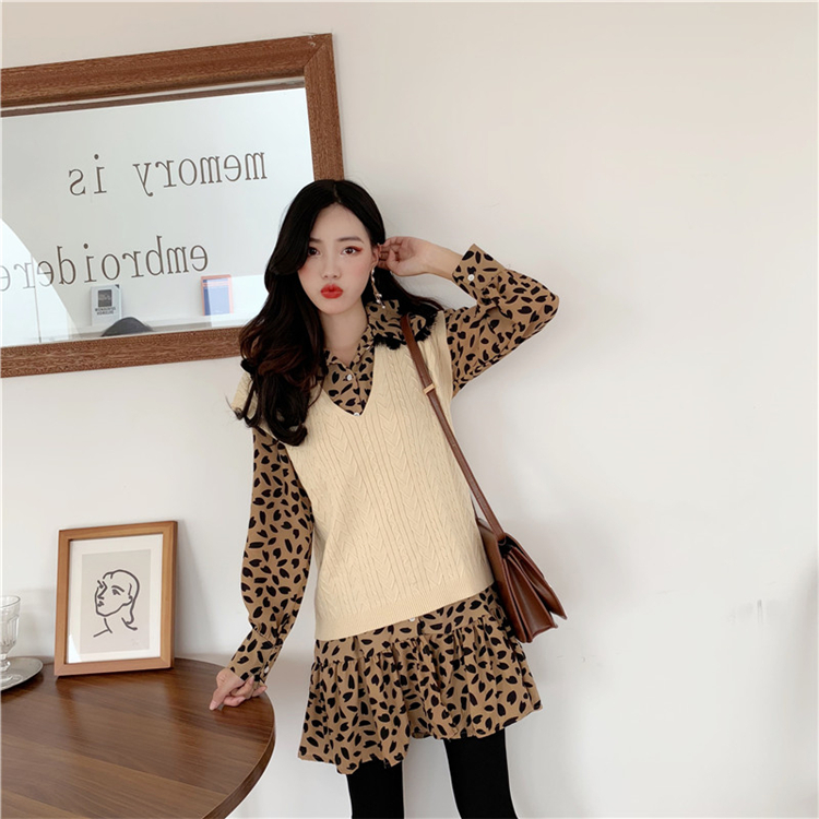 兩件套裝,豹紋碎花連衣裙+背心馬甲,