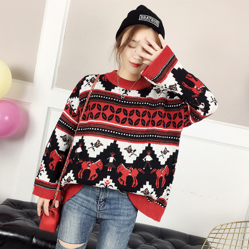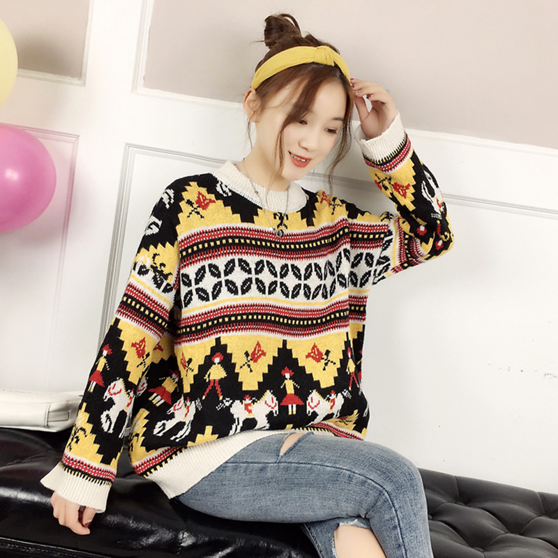 慵懶風套頭毛衣外套女秋冬裝2018新款韓版寬松加厚撞色條紋針織衫