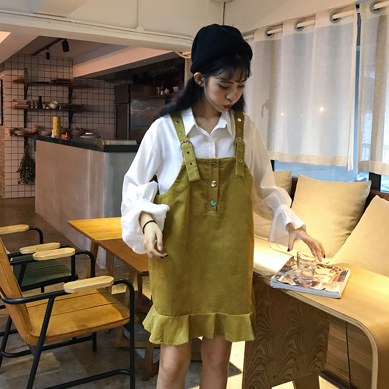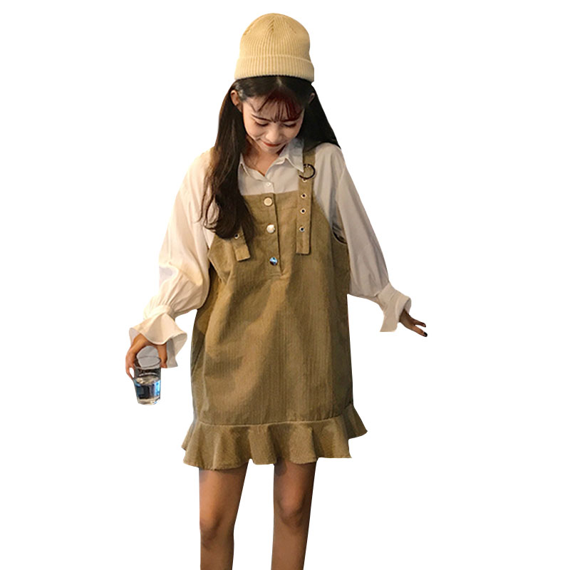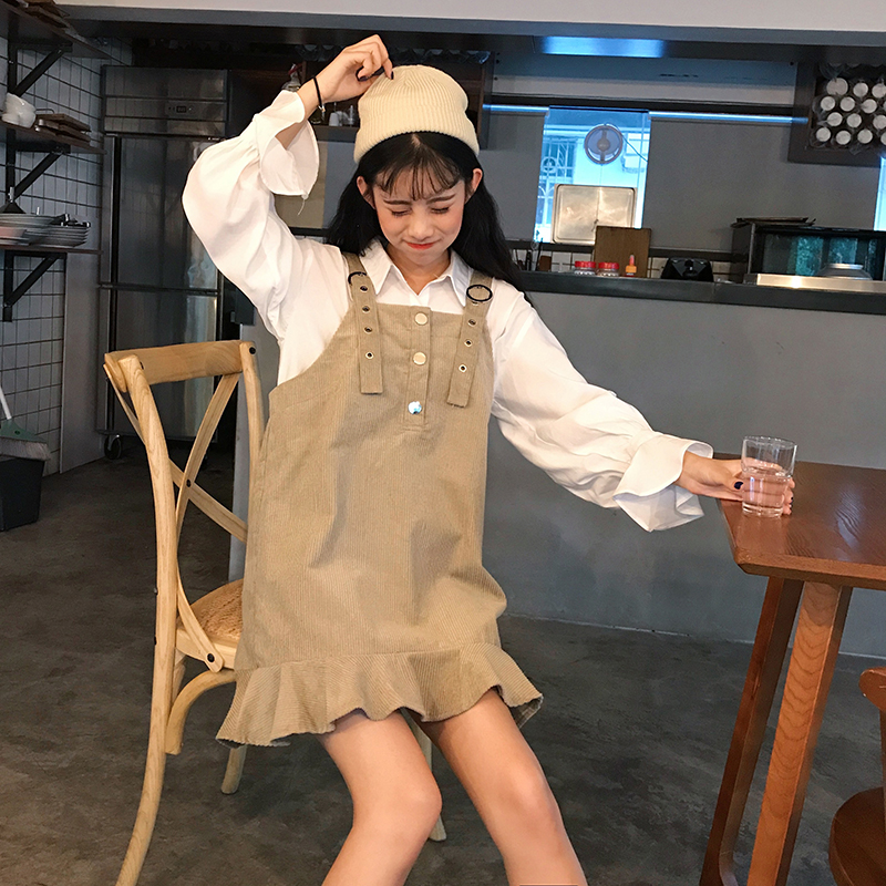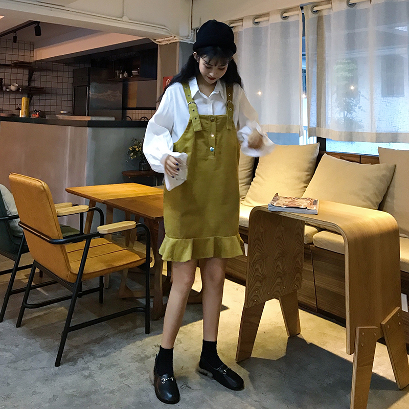 2018新款秋冬女裝韓版中長款荷葉邊背帶裙寬松顯瘦連衣裙學生裙子
