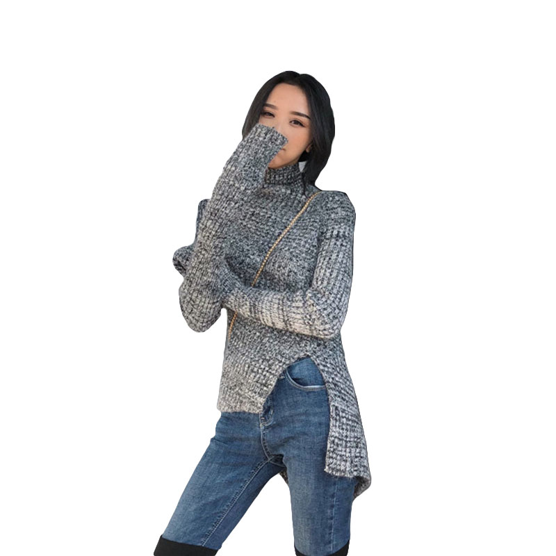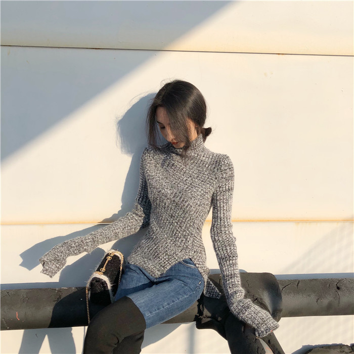 毛衣外套女韓版2018新款高領修身顯瘦下擺開叉不規則毛衣針織衫潮