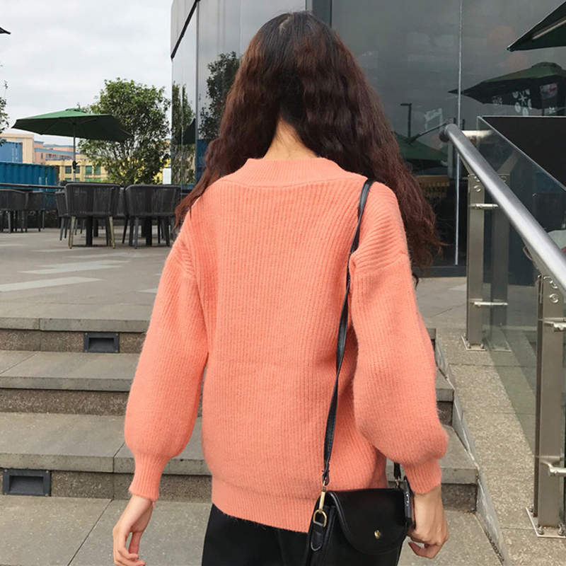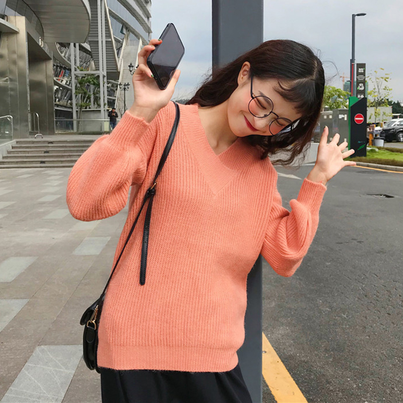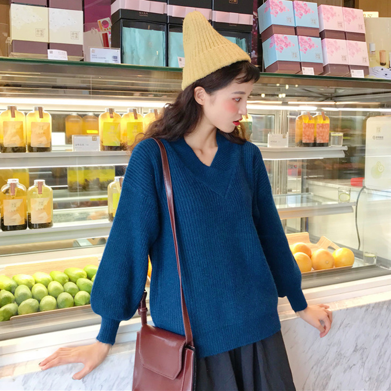慵懶風套頭毛衣外套女秋冬裝2018新款韓版百搭寬松V領長袖針織衫
